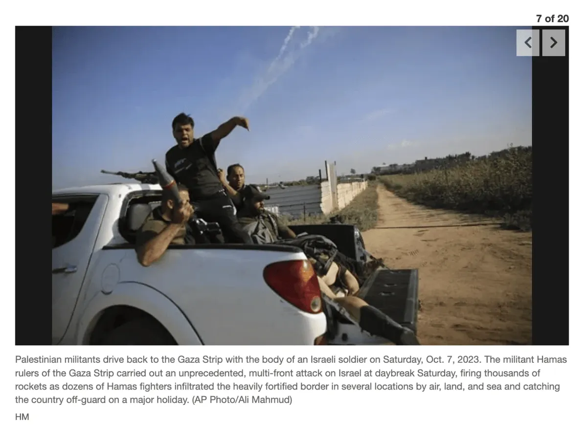 Организация отмечает, что AP опубликовало 7 октября фотографии проникновения боевиков через границу Израиля. В подписях к снимках есть имена сделавших их фотографов: Хасана Эслайи, Юсефа Масуда, Али Махмуда и Хатема Али.