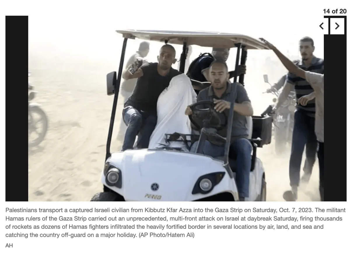 «Али Махмуду и Хатему Али было поручено фотографировать ужасающие похищения израильтян в Газу. Махмуд запечатлел пикап, в котором находилось тело израильтянки немецкого происхождения Шани Лук, а Али сделал несколько снимков похищения людей в секторе», — пишет HonestReporting.