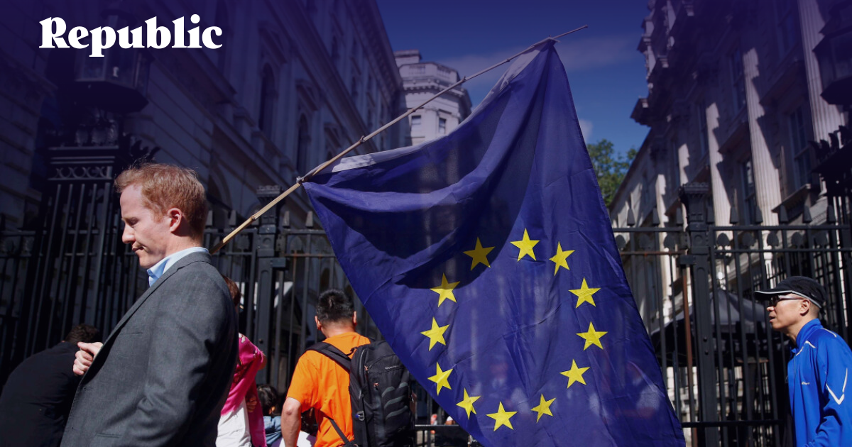 Человек с флагом Евросоюза у резиденции премьер-министра Великобритании