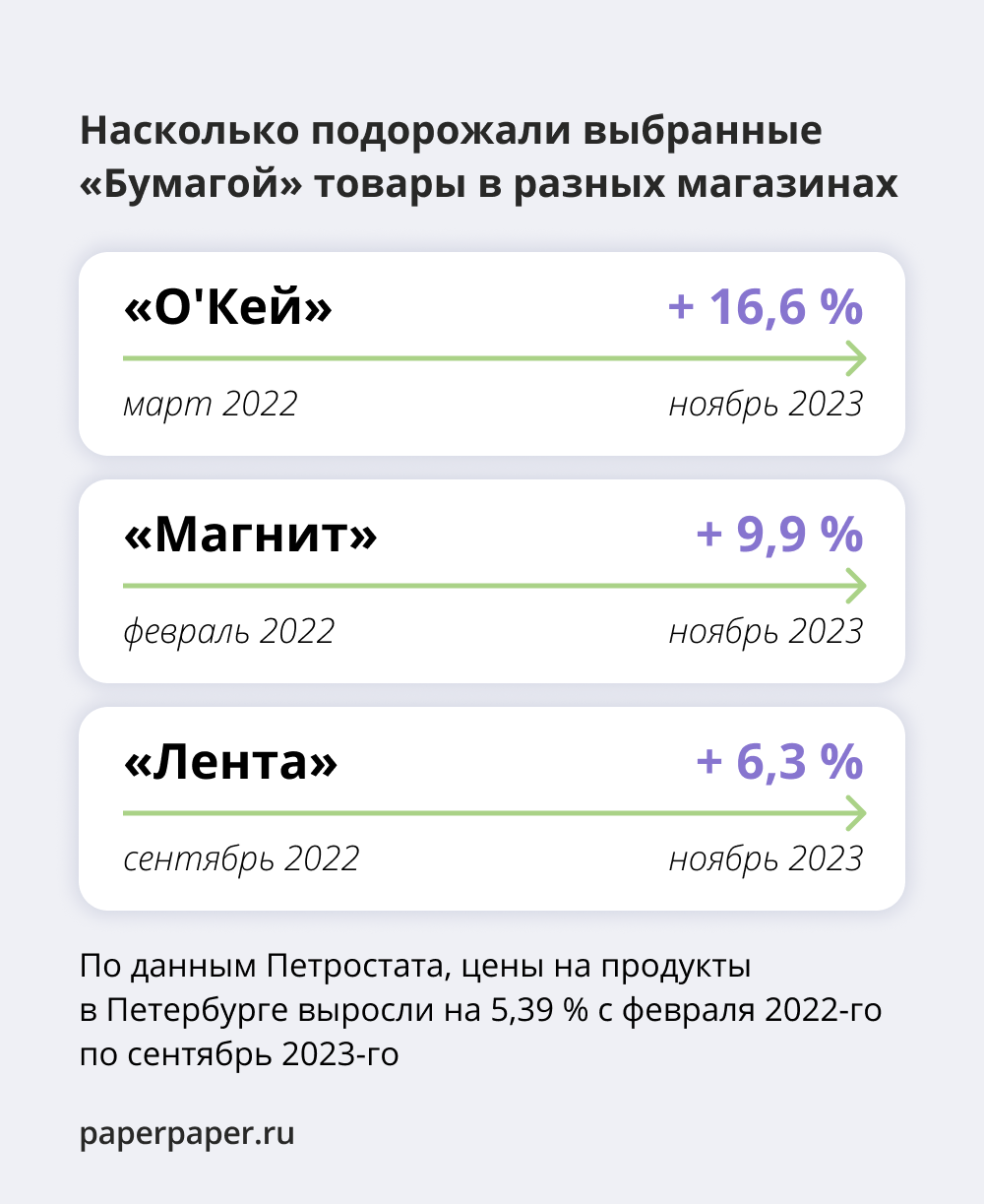 Стоимость корзин в 2022 году составляла от 3,2 до 4,8 тысячи рублей. К ноябрю 2023 года цена набора в «Ленте» прибавила 6,3 %, в «Магните» — 9,9 %, а в «О’Кее» — 16,6 %. При этом в абсолютных цифрах корзина, собранная в «О’Кее», оказалась самой дешевой. Во всех трех случаях подорожание было большим, чем прирост цен на продукты по версии Петростата.