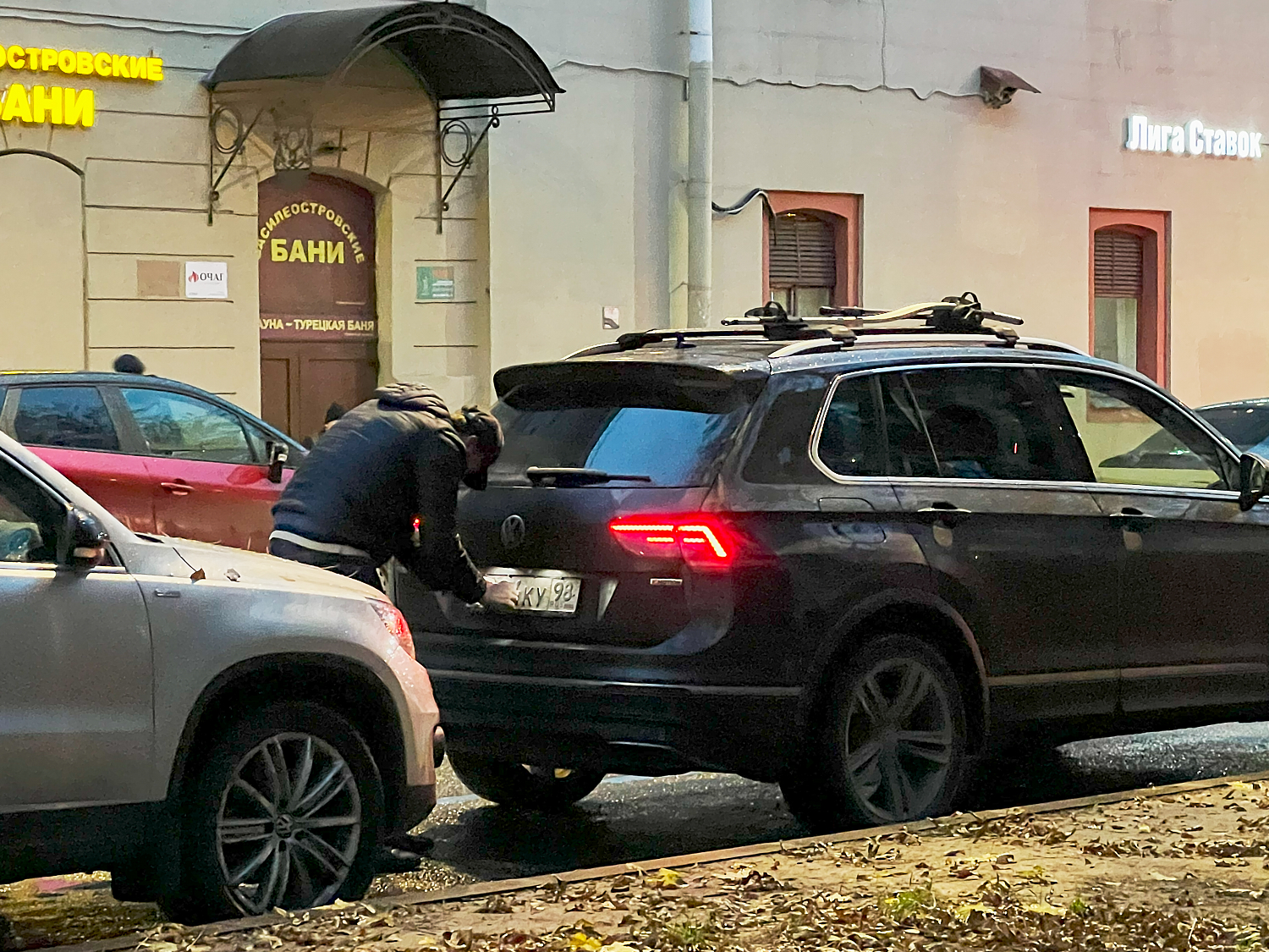 Опавшая листва, тряпочка и реклама кексов. Показываем, чем закрывают номера машин василеостровцы, не желающие платить за парковку