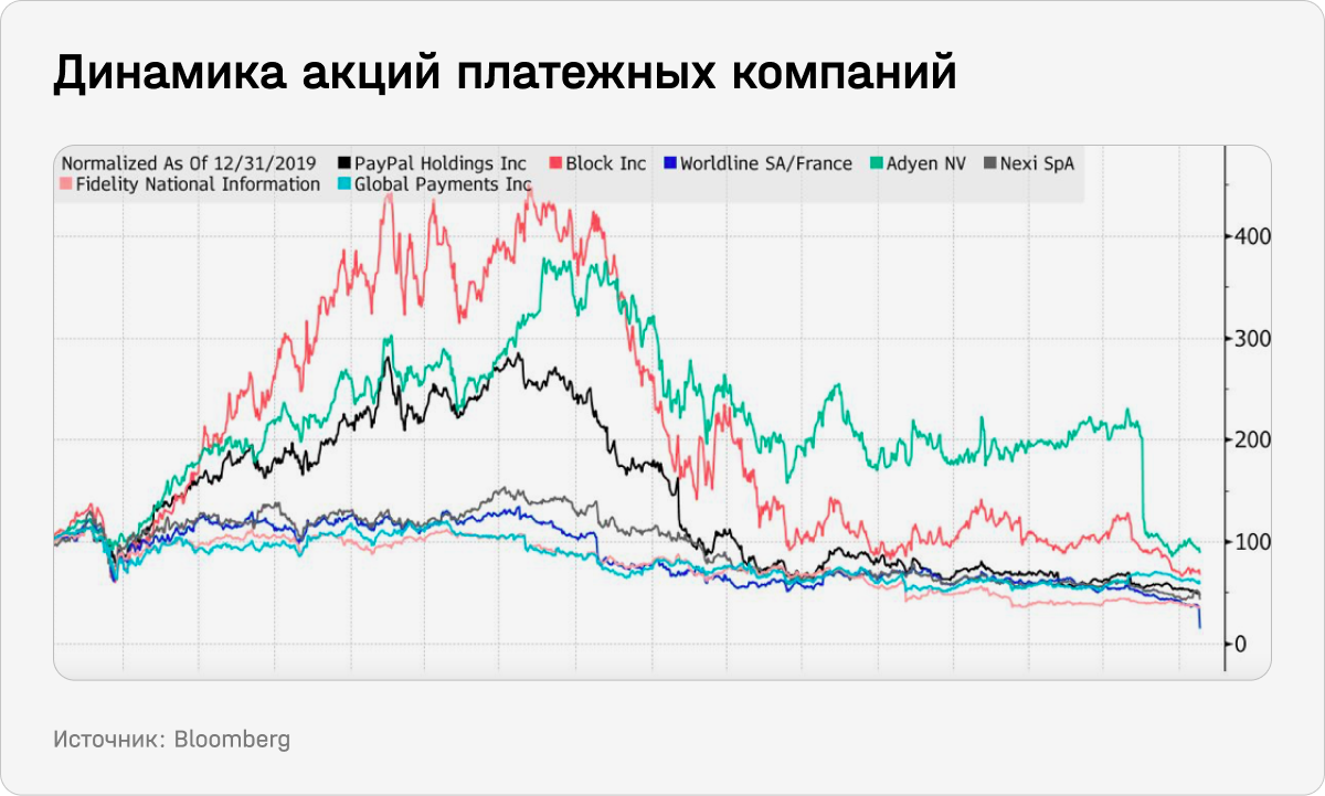 Еще в 2021 году индустрия онлайн-платежей переживала бум из-за повсеместного внедрения цифровой коммерции, которая наступала на офлайн-ритейл. С тех пор темпы развития бизнеса платежных компаний замедлились, а их акции упали в цене. Например, бумаги Block и PayPal за последние два года упали более чем в четыре раза.