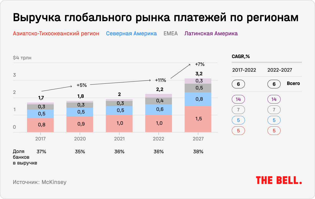 В результате доходы от цифровых платежей растут двузначными темпами второй год подряд. И это значительно превышает установившуюся долгосрочную тенденцию (7% CAGR). В 2022 году они выросли на 11%, до $2,2 трлн (см. график ниже). Для сравнения, чистый процентный доход на глобальном банковском рынке в том же году составил $5,1 трлн.