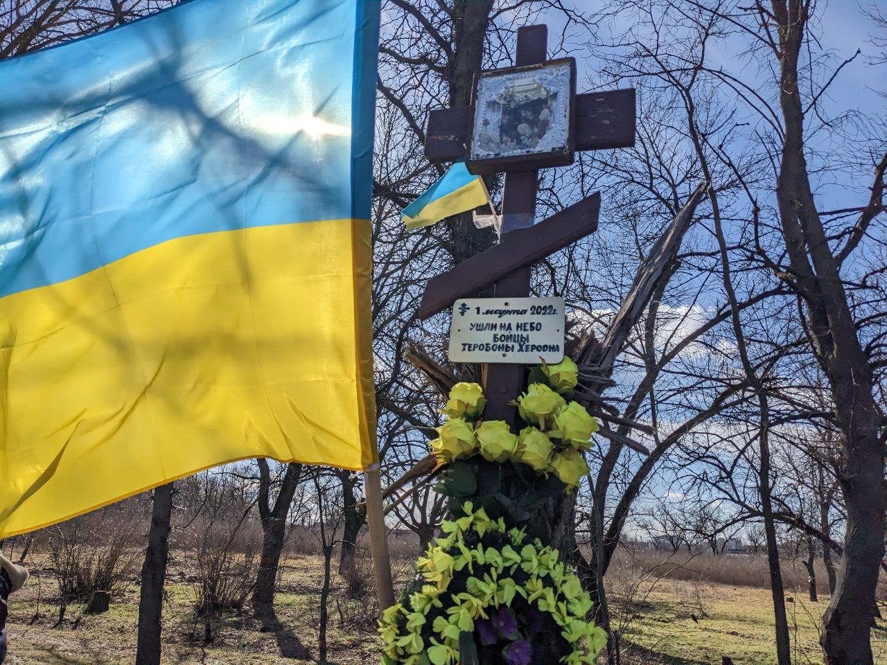 Сегодня практически все стволы на деревьях в Сиреневом парке Херсона побиты осколками или пулями: это следы тех самых боев. На входе в парк установлены крест и мемориальный камень – в память о погибших бойцах сопротивления.