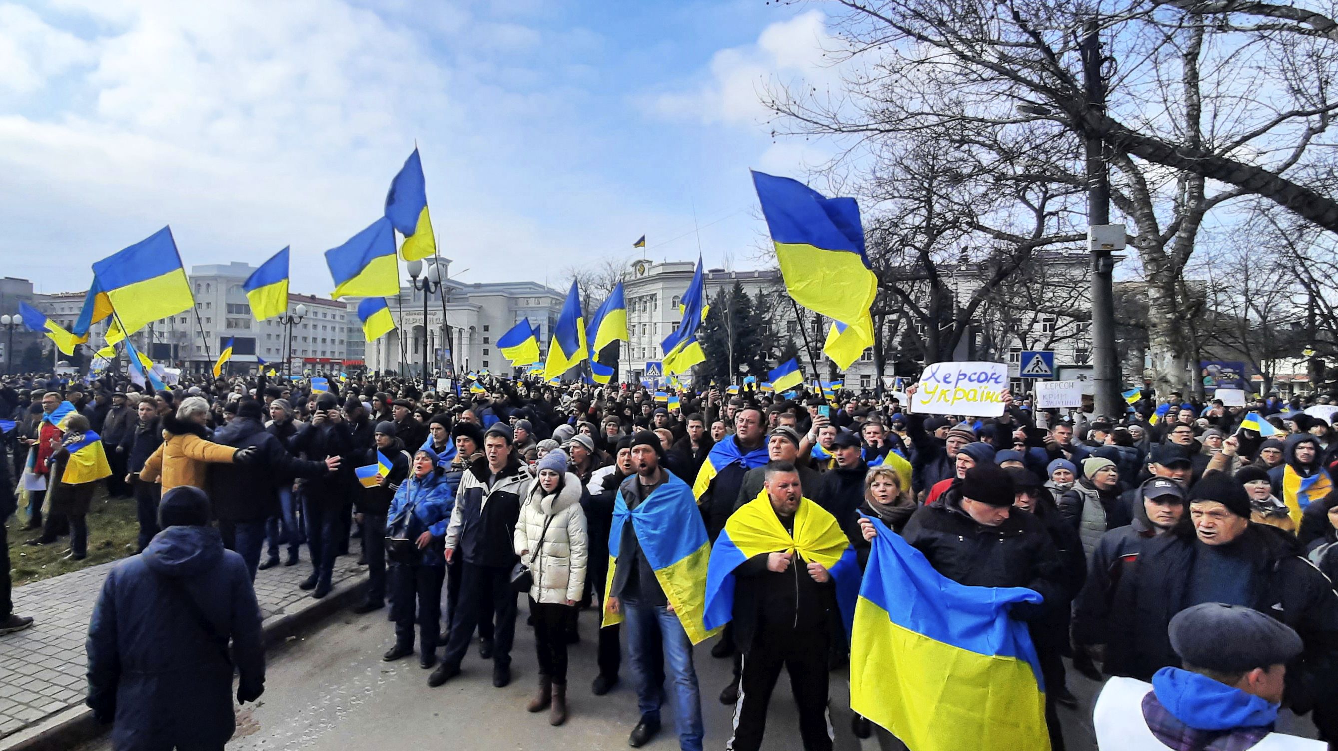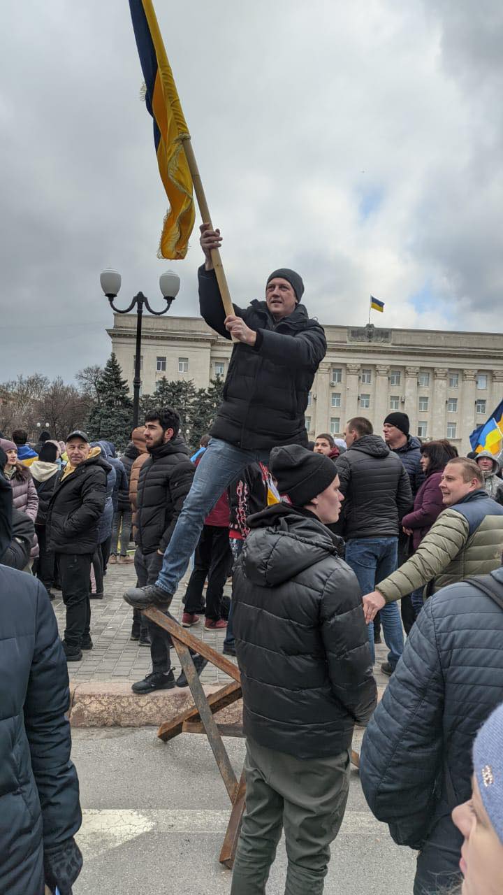 После оккупации Херсона жители города долго не сдавались: они начали собираться на площади Свободы и брали с собой украинские флаги. Таким образом они хотели продемонстрировать, что Херсон – украинский город и российских военных здесь не ждали.