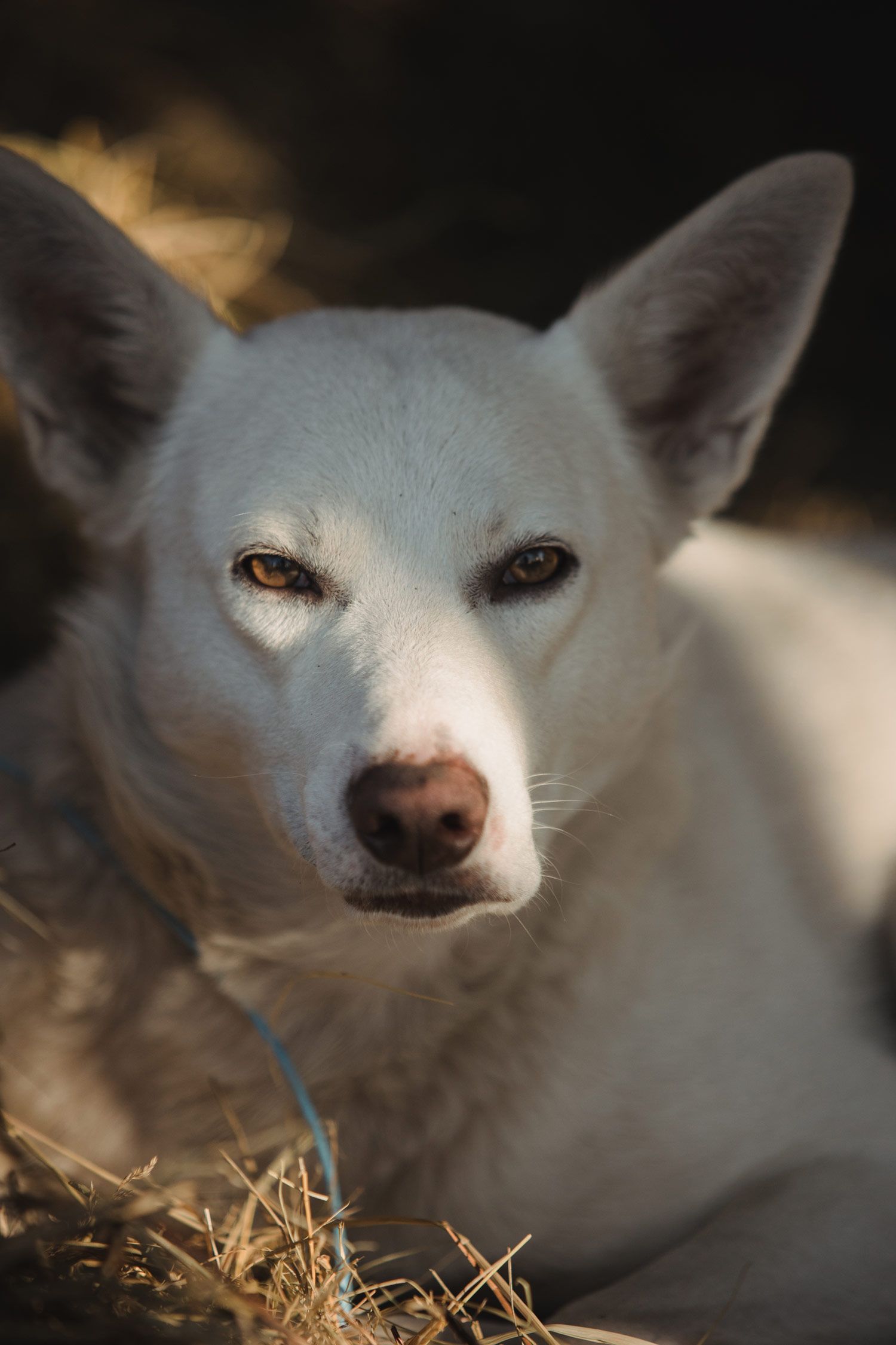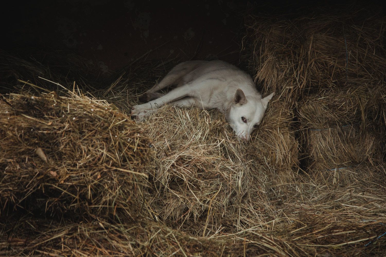 Снежку примерно два-три года. Он очень добрый и играет со всеми, кто сюда приходит. Больше всего пес любит, когда из него вытаскивают клещей. И не любит, когда мимо кто-то едет на велосипеде. Снежок обожает спать на сене.