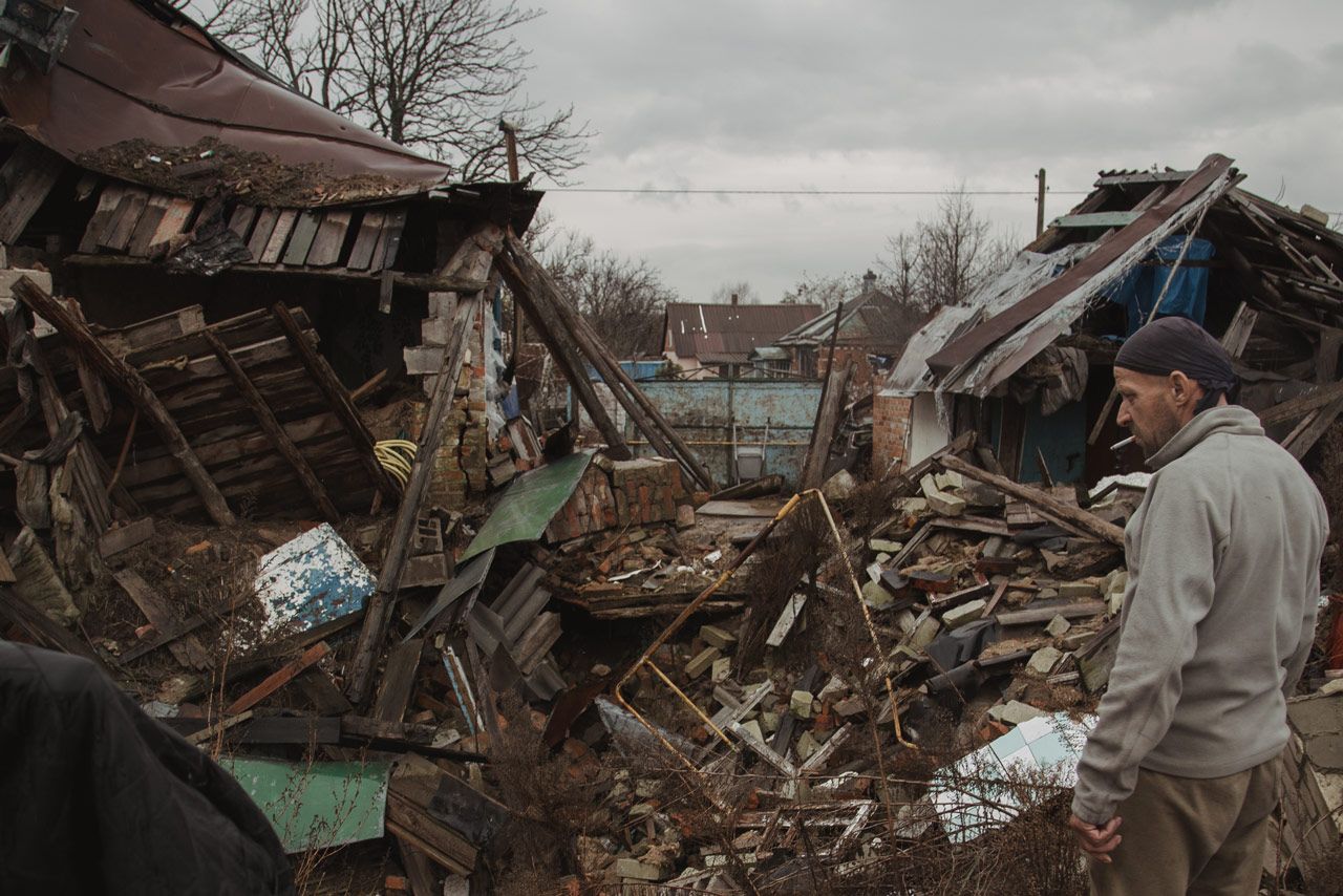 Пока мы жили в оккупации, здесь только пара домов были разрушены войной. Наши [ВСУ] стреляли точечно — понимали, что тут люди. Тогда еще можно было спокойно пойти и по всему селу собак покормить. А вот когда нас освободили [от российской оккупации] 5 мая и наши встали в Русских Тишках, а русских прогнали на полтора километра, в Борщевую, тогда и началась жара. Потому что с Борщевой русские сюда начали стрелять беспощадно.
