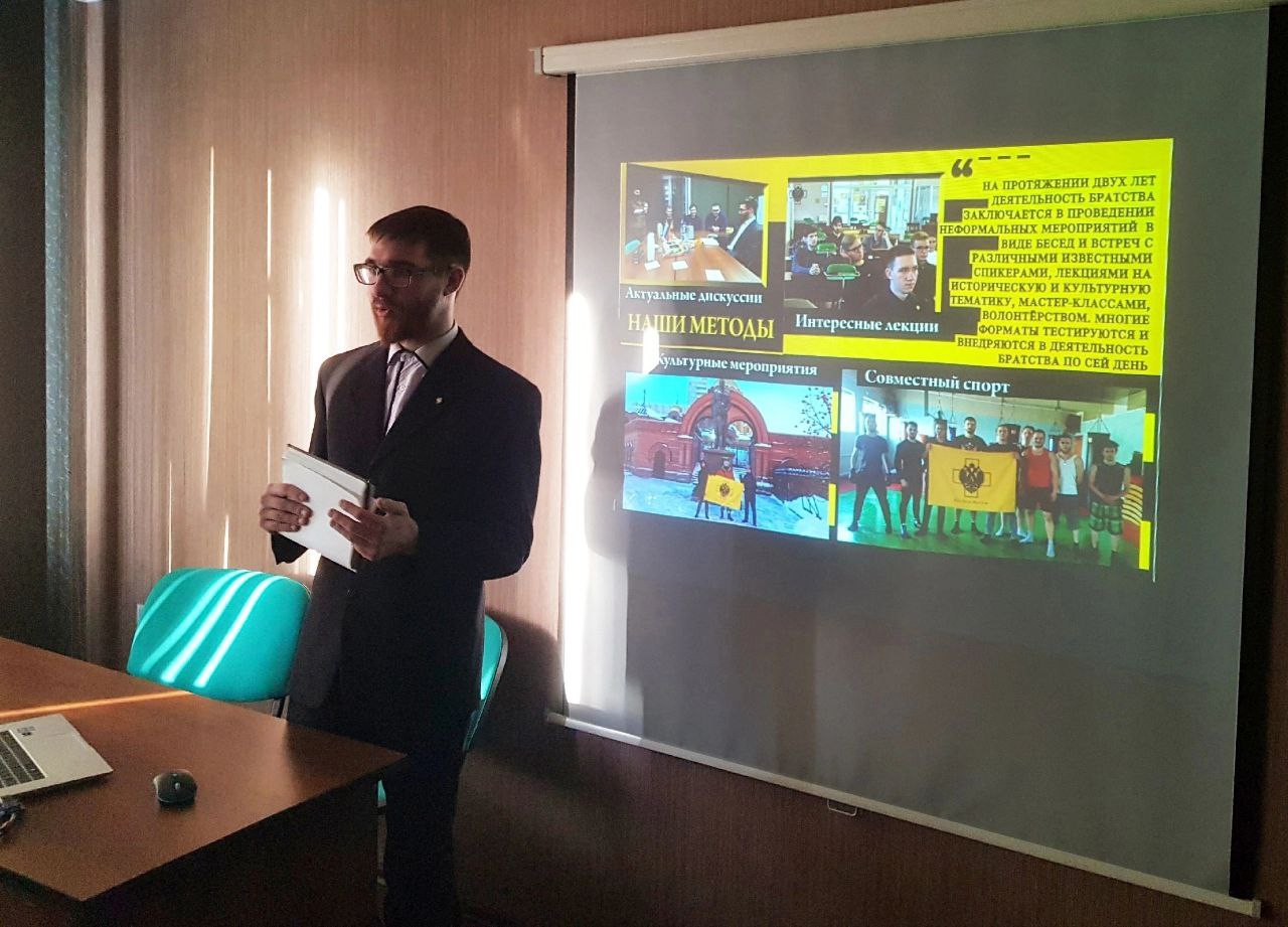 На мероприятии Роман Куц прочитал небольшую лекцию про «патриотизм» и предпосылки создания Братства, после чего представитель клуба академистов в НГУ Роман Чепенков рассказал студентам про историю и ценности движения.