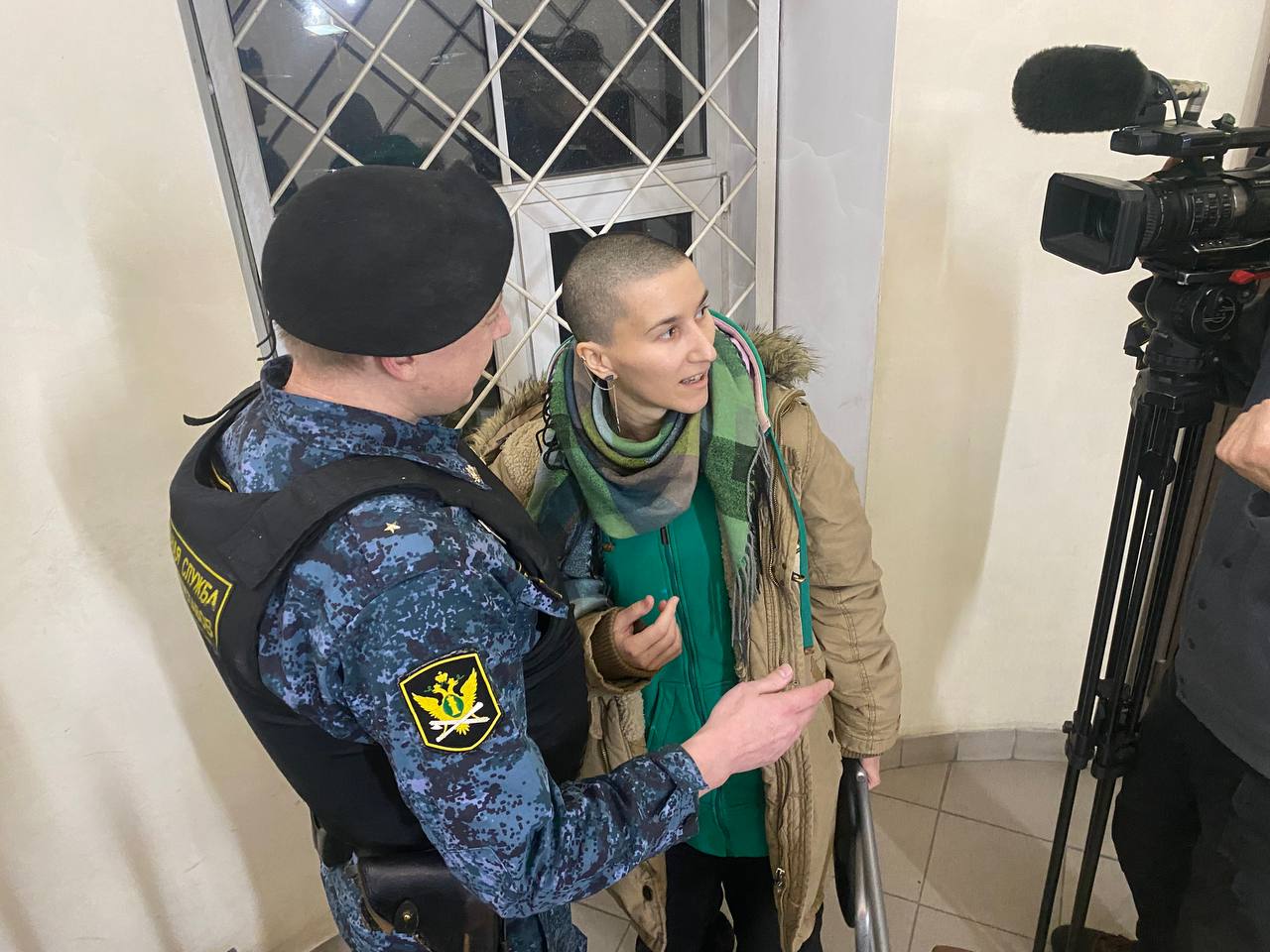 14.58. Сашу провели по коридору семь сотрудников полиции. Слушатели вновь встречают ее ободряющими возгласами.
