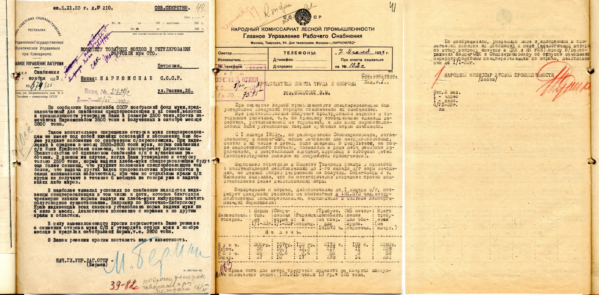 В записке руководителя ГУЛАГа Матвея Бермана, направленной в Комитет товарных фондов при СТО, говорится о дополнительном снижении отпуска муки для спецпереселенцев в ноябре 1933 года с 3500 до 2500 тонн. Берман пишет, что дети из семей раскулаченных получают 4 килограмма муки в месяц и «вынуждены влачить полуголодное существование». Лобов, используя бюрократические обороты, информирует главу СТО: лишение семей высланных кулаков хотя бы минимальной возможности прокормиться привело к тому, что «на почве недостаточного питания проявились в ряде мест массовые заболевания с смертельным исходом взрослых и особенно детей».