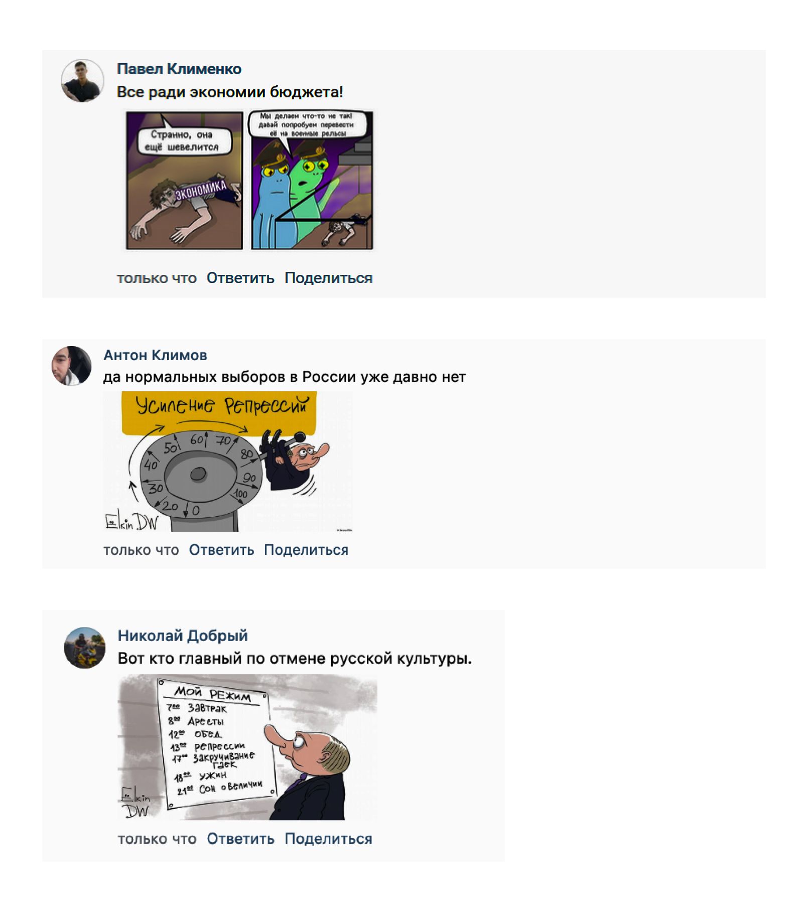 «Комментарии не обязательно должны быть объемные. Никакой нормы нет. Комментарий может быть и из одного предложения типа: „Уже полгода как Киев берут за три дня“. Контекст такой, что в новости ложь о том, что „все идет по плану“. Но комментарий должен быть эффективным — желательно, чтобы оказался одним из первых в посте, чтобы набрал побольше лайков и ответов», — говорил собеседник «Фонтанки».