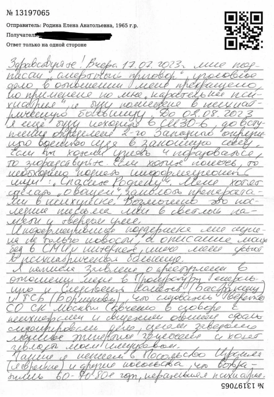 Из СИЗО Елена Родина стала посылать волонтерам, которые ей писали, сигналы SOS. Она утверждала, что ее подвергли «карательной психиатрии» и хотят превратить в овощ.