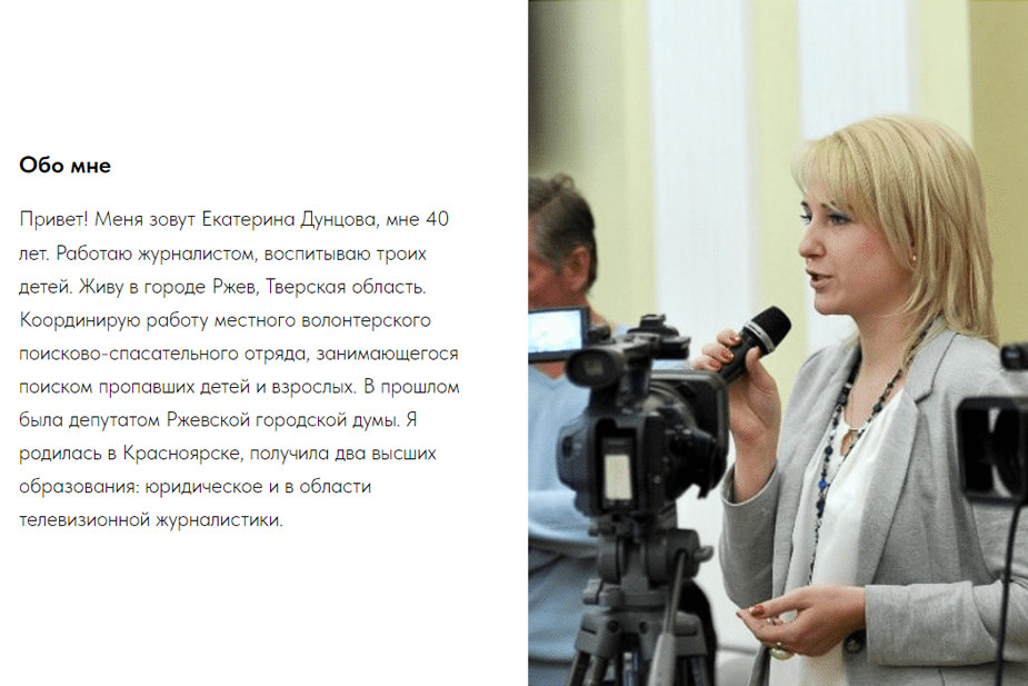 Активистка и журналистка из Тверской области Екатерина Дунцова 16 ноября объявила, что будет участвовать в выборах президента РФ в 2024 году. В начале 2010-х Дунцова пыталась добиться возвращения прямых выборов мэра в родном городе Ржеве. Эта кампания привела женщину в политику. В 2019 году она стала депутаткой Ржевской гордумы. В интервью «7х7» Екатерина Дунцова рассказала о своей мотивации, рисках и предвыборной программе, основанной на демократических ценностях.