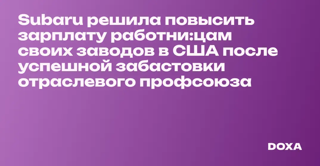 16 ноября автокомпания Subaru заявила, что поднимет зарплату сотрудни:цам. Детали нового договора пока что не разглашаются, так как сумма надбавок будет зависеть от того, какие контракты заключат сотрудни:цы Ford, General Motors и Stellantis, которые добились повышения зарплат во время забастовки.