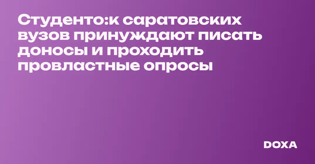 Студенто:к семи саратовских вузов принуждают писать доносы. Им направили опрос об отношении к власти, наличии знакомых-экстремисто:к и готовности участвовать в протестных акциях. Глава «Альянса учителей» Даниил Кен считает, что опрос не является иницииативой вузов, а «спущен сверху».