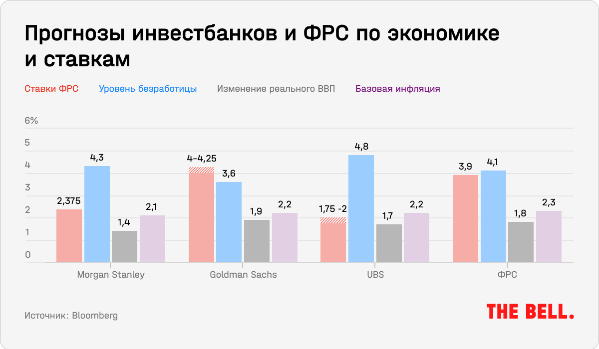 Прогноз GS находится ближе всего к прогнозу ФРС, сделанному в сентябре, а также к ожиданиям рынка, отмечает Bloomberg. Следующий раз чиновники ФРС обновят свой dot plot в декабре.