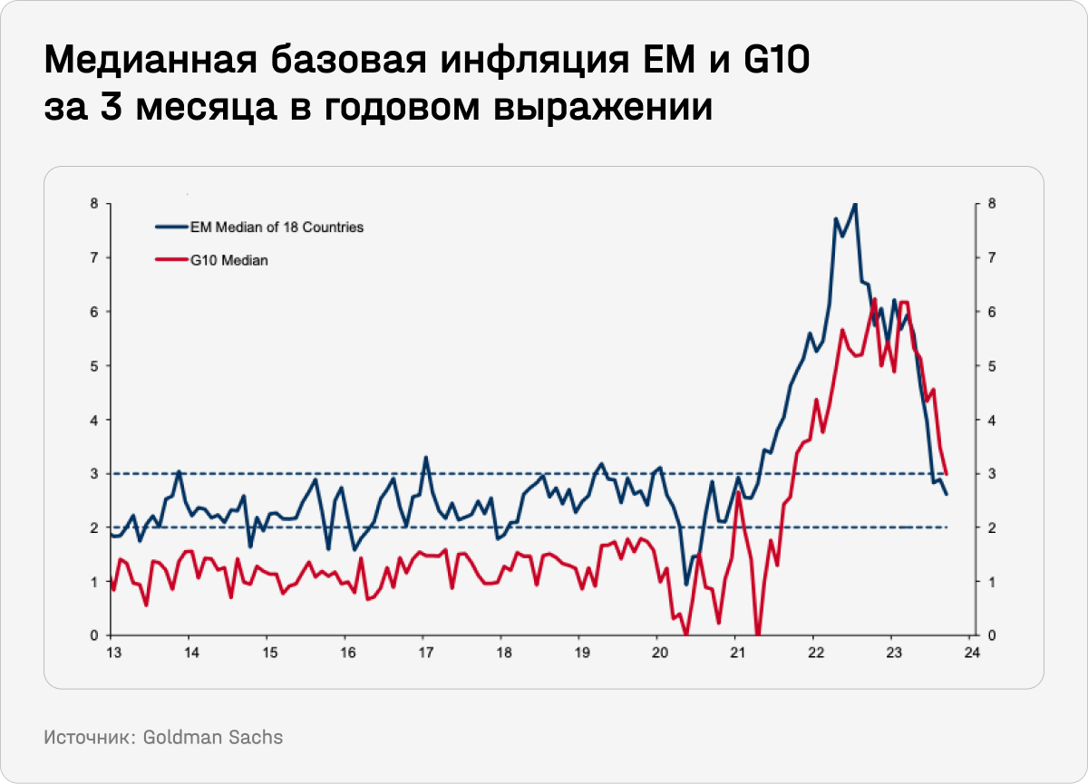 В США и во многих других развитых (за исключением Японии), а также развивающихся (за вычетом Китая) странах инфляция во второй половине года приблизилась к таргету. Это произошло без значительного замедления экономического роста, роста безработицы или рецессии, что дает основание говорить о мягком приземлении.