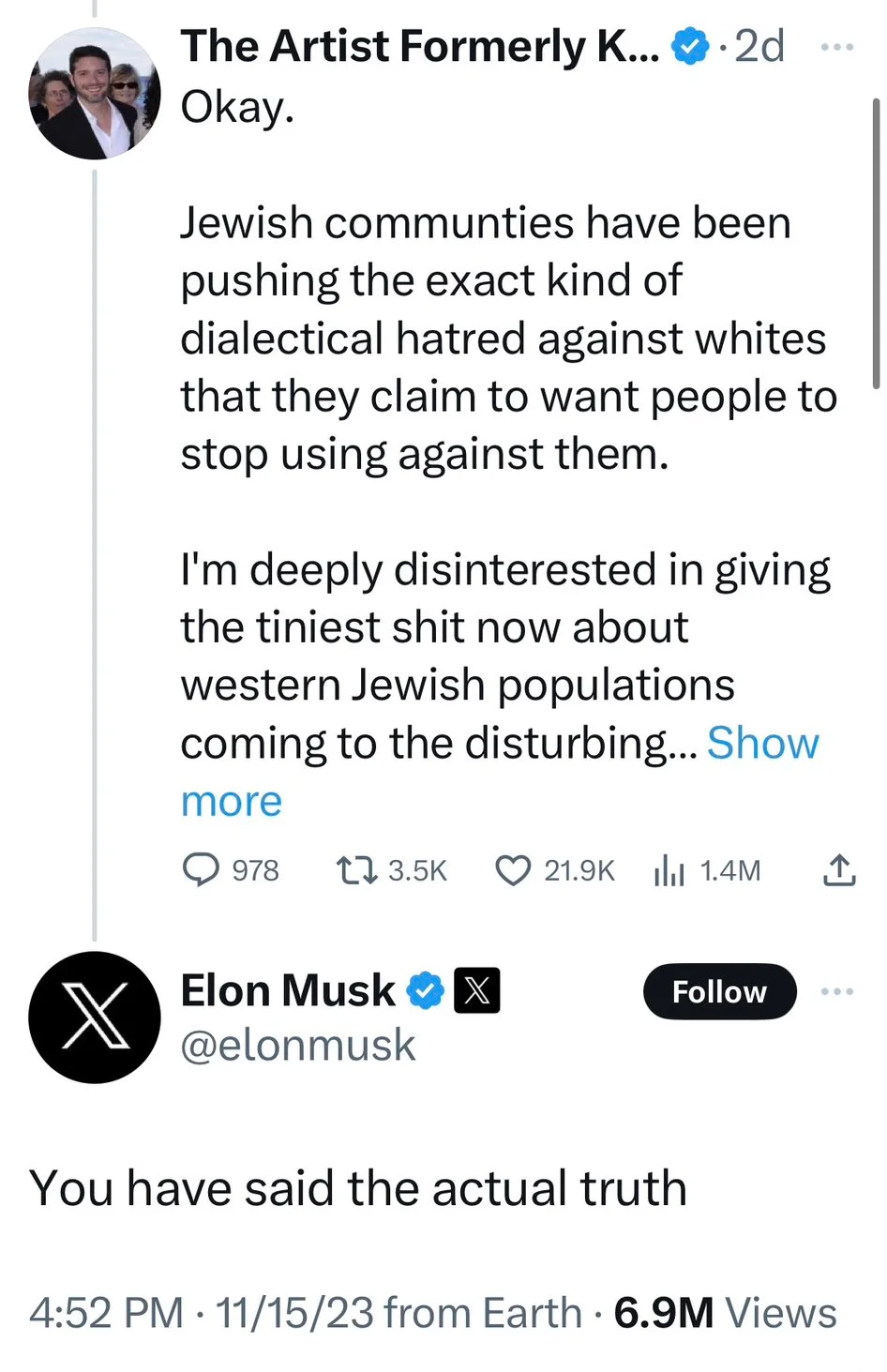 The Hollywood Reporter также связывает уход компаний с антисемитским высказыванием Илона Маска. Один из пользователей X написал, что евреи разжигают ненависть к белым людям, на что предприниматель ответил: «Вы сказали настоящую правду».