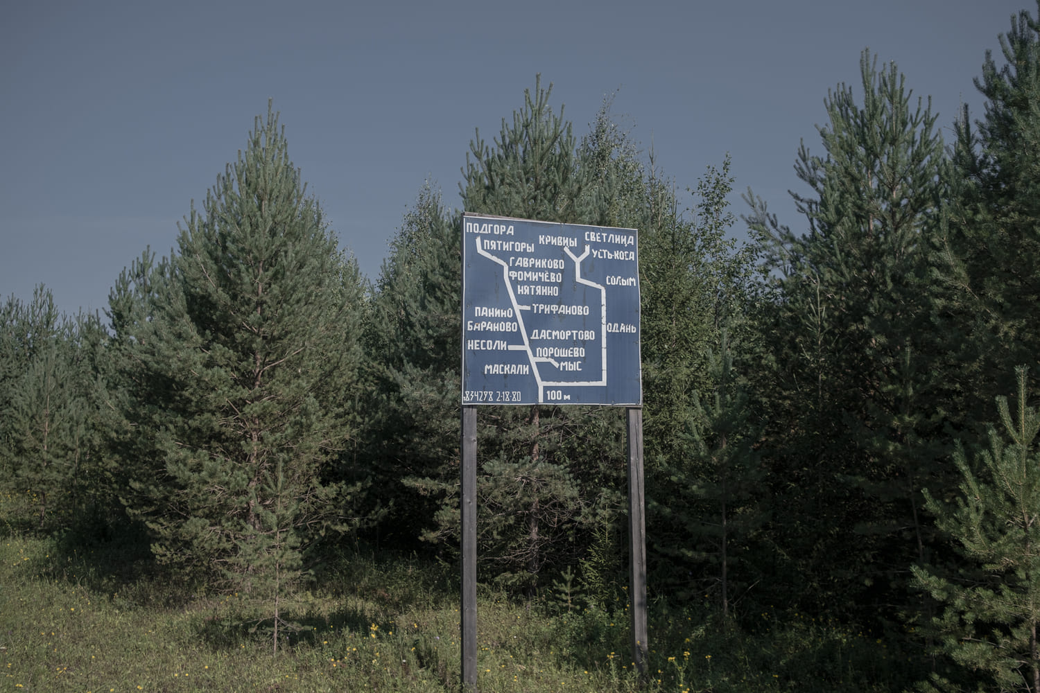 После села Коса, центра муниципального округа, дорога переходит в пыльную грунтовку, по которой со всей дури летают лесовозы. Перед очередным поворотом вкопана дорожная схема. Из восемнадцати посёлков на этой схеме "живыми" остались лишь девять, в трёх из них живут по 3–5 человек.
