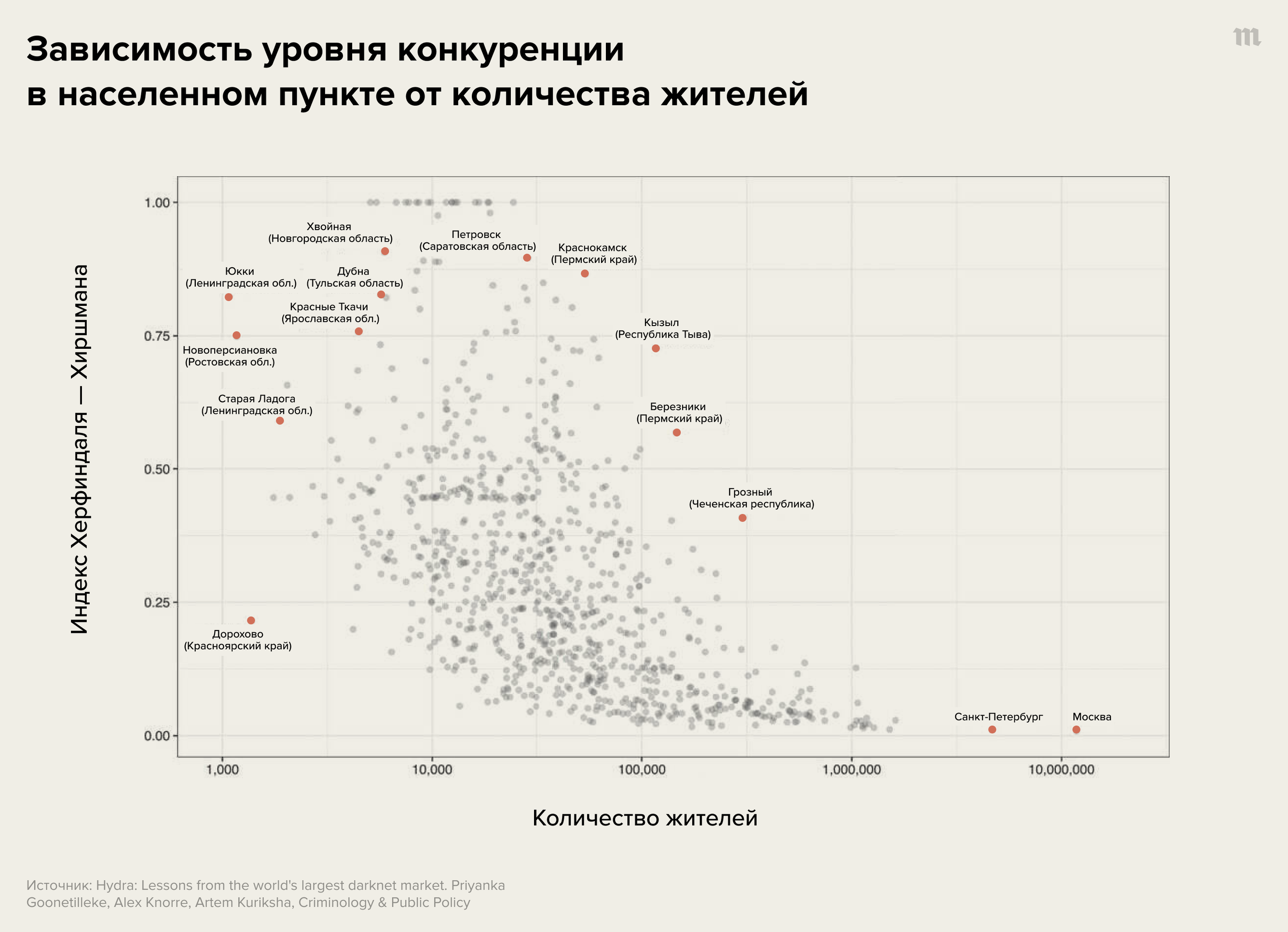 Удивительным показалось то, насколько этот рынок конкурентный, я ожидал, что магазинов будет поменьше. Для оценки уровня конкуренции мы использовали такой показатель, как HHI, — это Herfindahl-Hirschman Index, индекс Херфиндаля — Хиршмана — число от 0 до 1, показывающее, насколько сконцентрирован или раздроблен какой-то рынок. Если индекс близок к 1, значит, рынок монополизирован одной компанией. Если индекс близок к 0 — рынок конкурентен, с большим количеством компаний, каждая из которых занимает не очень большую долю. Мы рассчитывали этот индекс для «Гидры» в целом, для отдельных типов наркотиков и для отдельных городов. Для «Гидры» в целом индекс близок к нулю — 0,004. Рынок кокаина более сконцентрирован, чем другие, но все равно конкурентен (0,027). В статье есть график, показывающий интересное: чем меньше город, тем менее конкурентен там рынок.