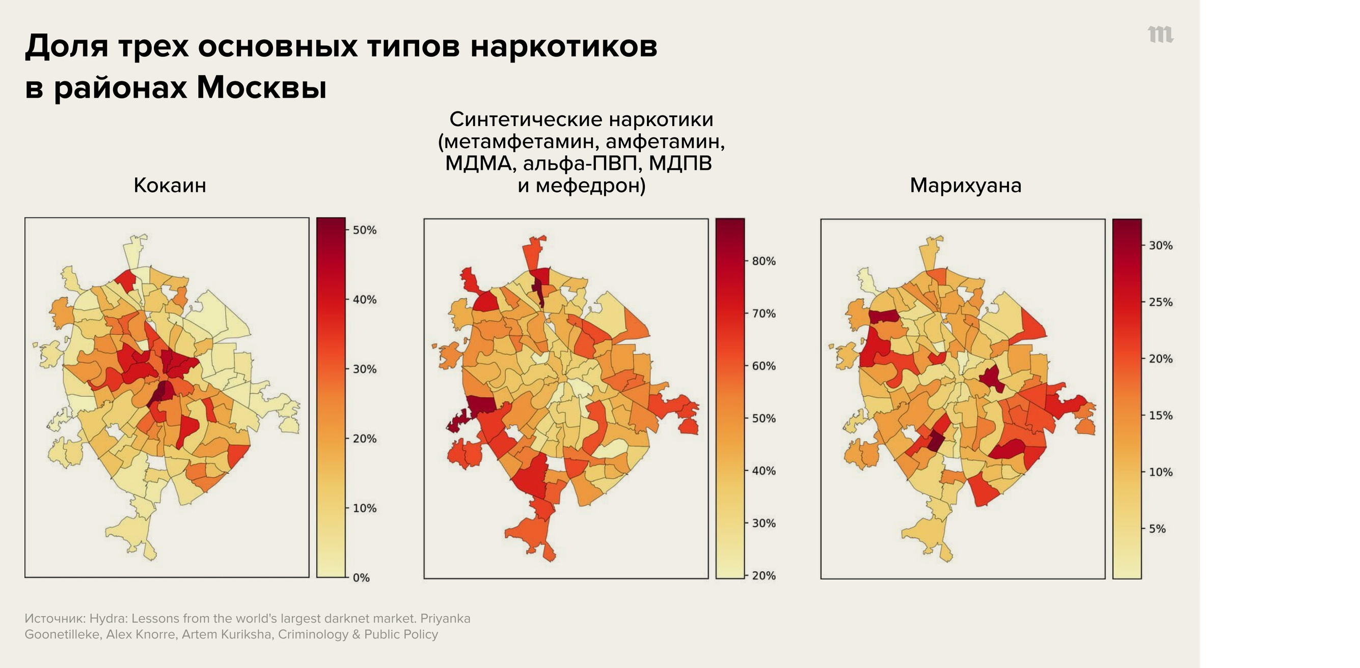 Объем данных по Москве позволил построить распределение предложения «Гидры» по столичным районам. Оказалось, в частности, что предложение кокаина концентрируется в деловом центре города, а дешевых синтетических наркотиков — метамфетамина, альфа-ПВП и мефедрона — на окраинах.