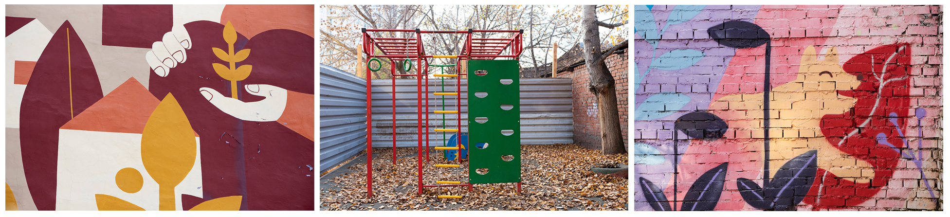 Андрей убежден: людям нужен стимул, почву надо создавать, чтобы захотелось делать хорошее. Если они видят, что тут убирают, тут облагораживают, запускается работающий механизм. Смотришь, а они уже и сами что-то сделали, предложили, подсуетились. А когда не делается ничего, сложно начать. Года три назад к Андрею пришли художники, предложили дом разрисовать – бесплатно. Он сразу же согласился, подписал необходимые бумаги. Теперь на фасаде красуется фреска – женщина, склонившаяся над ростком. Потом вспомнил, что во дворе есть стена отделения полиции – страшная, обшарпанная, объявлениями заклеенная. Попросил разрисовать и ее. Художники согласились. Но пришлось у полиции год разрешения добиваться.