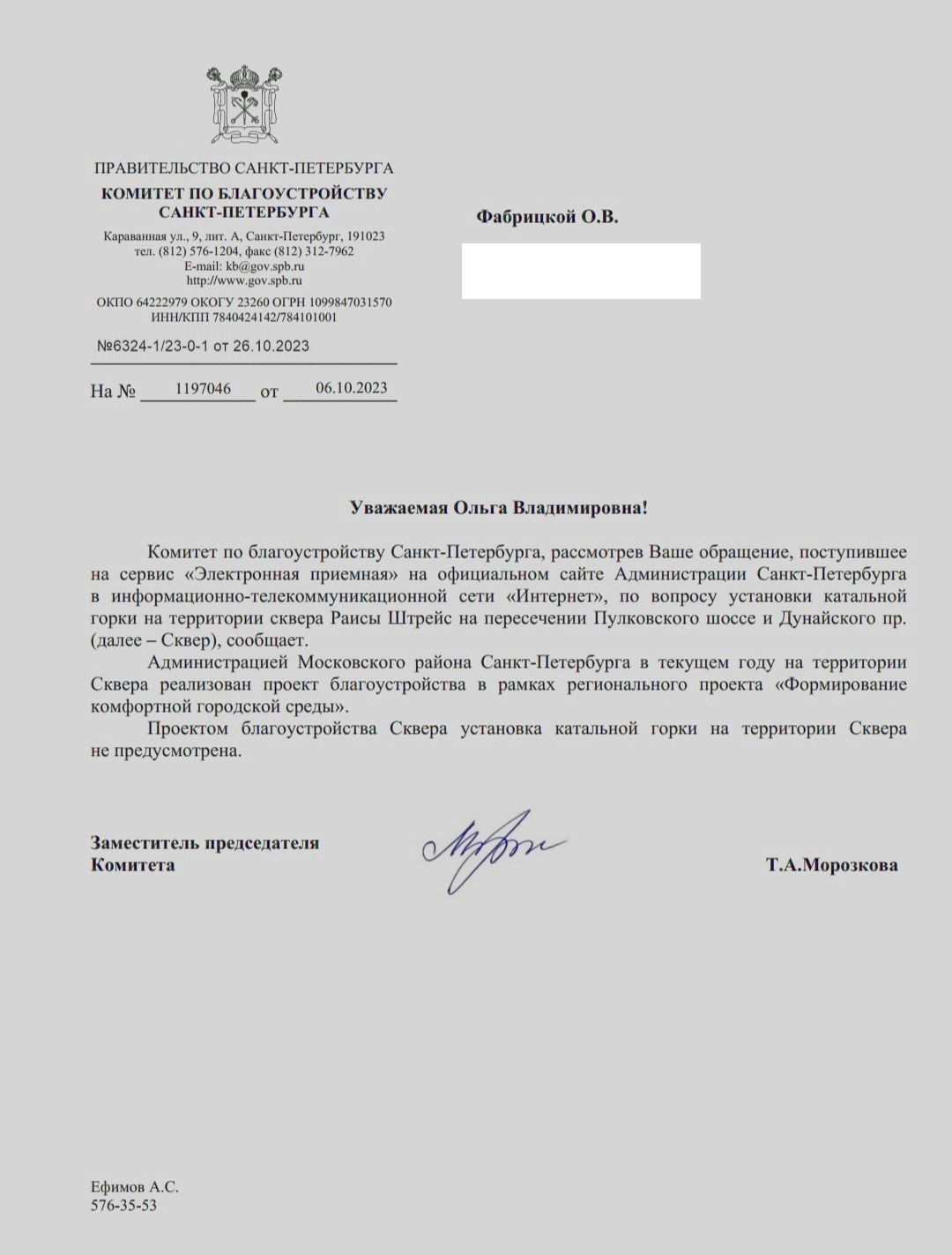 В документе чиновников отмечается, что установка горки на территории сквера Раисы Штрейс «не предусмотрена» проектом благоустройства.