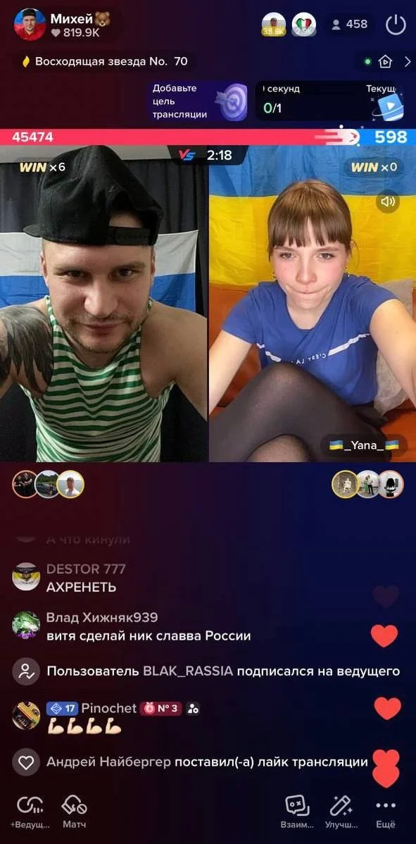 Такие политические баттлы смотрят от пары сотен до пяти тысяч человек. В чате люди обычно пишут патриотические комментарии — «Россия, вперед» или «Перемога буде за нами». Во время подготовки этого материала мы нашли восемь российских, украинских и белорусских тикток-блогеров, которые регулярно участвуют в подобных баттлах, пятеро из них постоянно выходят в эфиры друг с другом.