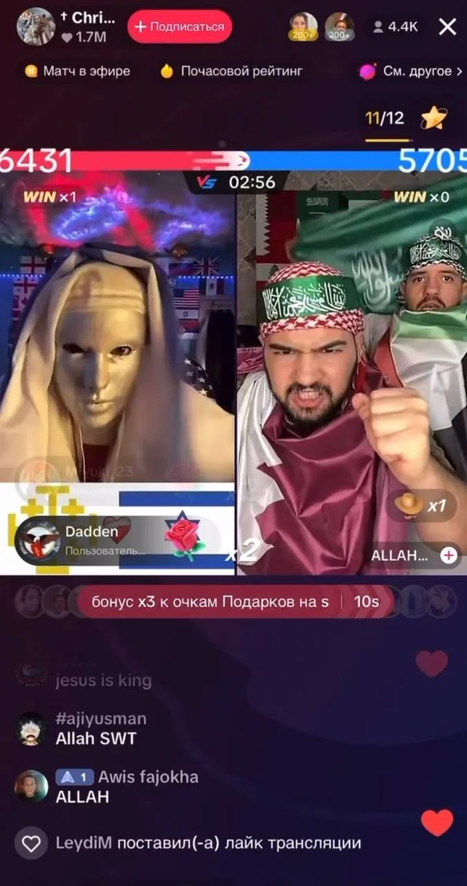 Эфиры с противостоянием тиктокеров, поддерживающих Израиль, и блогеров, выступающих на стороне арабских стран, появились вместе с режимом баттлов, до последнего обострения конфликта. Например, еще в конце 2022 года баттлы друг с другом устраивали тиктокеры с никами @jrbaldwiniv и @1salahaddinayyubi1. Первый тиктокер представлялся как Christian Power («Христианская сила»), он баттлился под флагом Израиля в костюме крестоносца. Его оппонент использовал имя SWORD OF İSLAM («Меч ислама») и баттлился в куфии. После нападения ХАМАС на юг Израиля такие стримы стали еще популярнее. Тиктокеры выходят в эфир в национальных костюмах или с флагами Израиля и Палестины и поочередно включают народные песни.