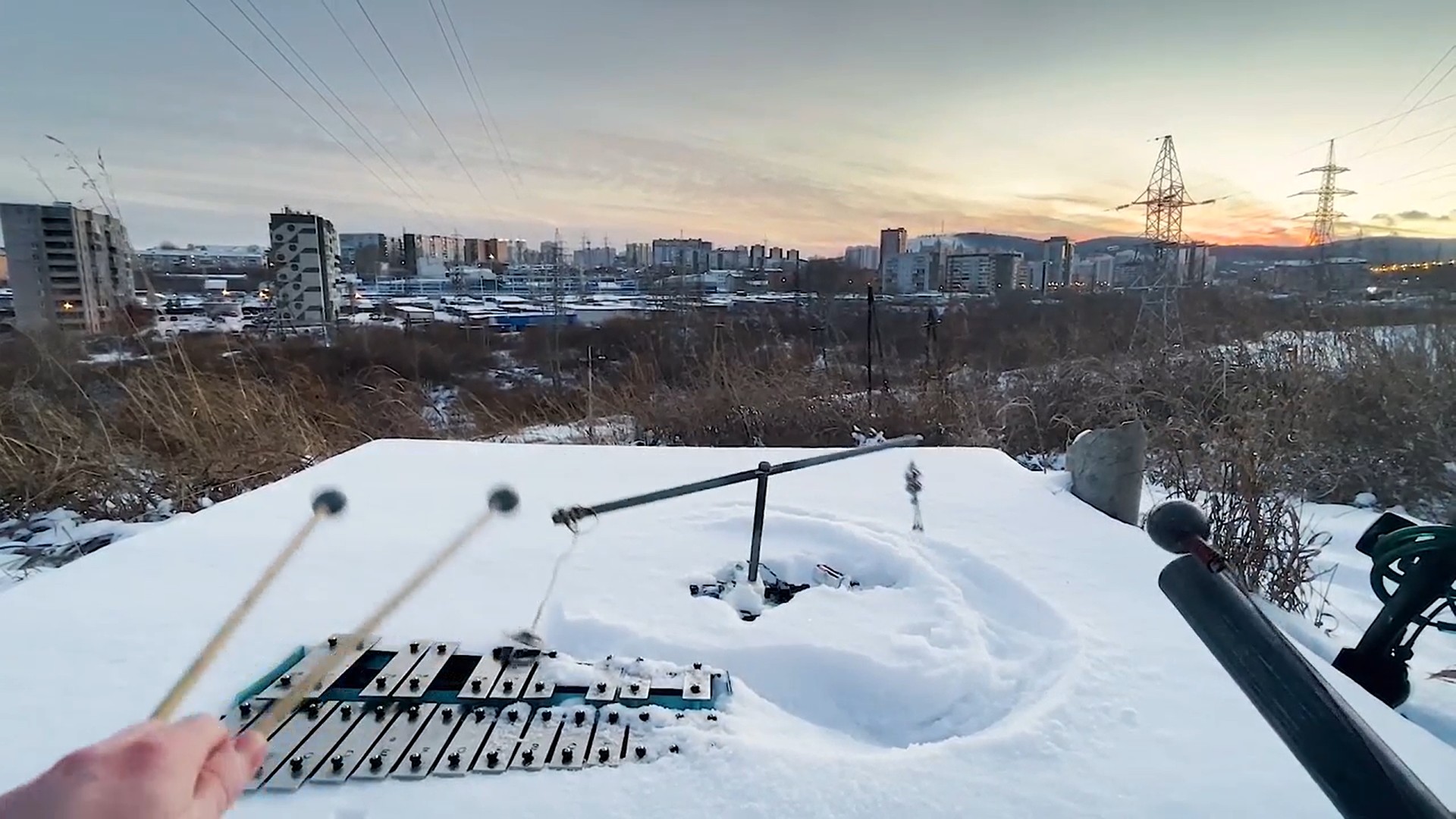 С видео, впрочем, он работал и раньше – снимал свои импровизации в том числе в неожиданных локациях и выкладывал в инстаграм. Перформансы, из которых состоит фильм, – это музыкальные импровизации, созданные в соавторстве с урбанистической или природной средой. В одном из эпизодов на оставленный в палой листве металлофон слетаются голуби и играют на нём клювами какую-то свою музыку. Александр музицирует на заснеженном берегу Енисея, у часовни Параскевы Пятницы (эту локацию узнают даже туристы, видевшие только главные достопримечательности города), у железнодорожного перехода, на берегу ручья. Эдакий гид по Красноярску и окрестностям, только не вербальный, а музыкальный.