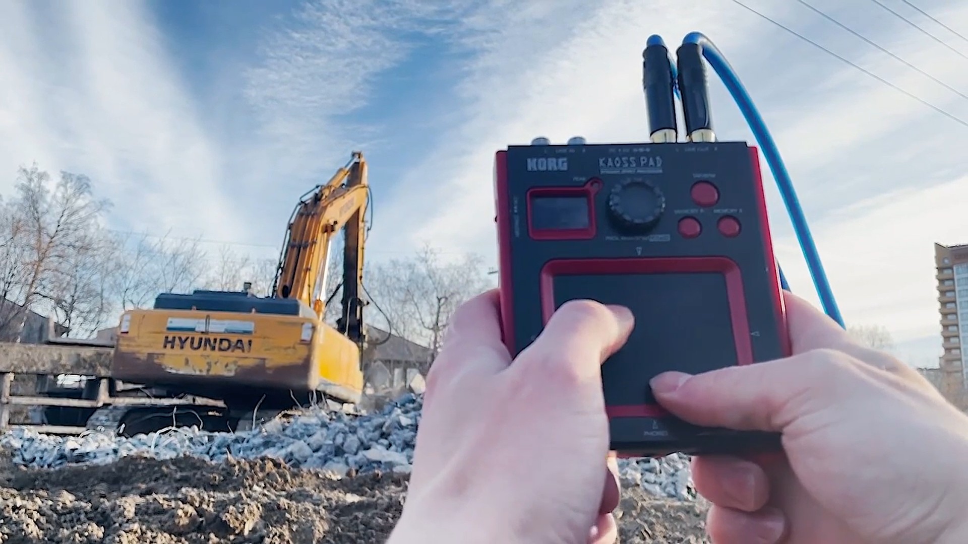 – Это электронный инструмент, издающий очень страшные звуки, – рассказывает Александр про коробочку с кнопками, которая появляется в кадре. – В зависимости от того, в какое место я ставлю палец, создаётся определённое звучание. Ролик снят почти спонтанно. Я ездил на работу на велосипеде мимо этой площадки. Видел, что туда подогнали технику. Решил там что-то записать, но понимал, что у меня будет мало времени. Если буду расставлять там инструменты, меня выгонят. Нужно было что-то очень быстрое и либо достаточное громкое, чтобы "перекричать" экскаватор, либо электронное, чтобы звук напрямую заходил в рекордер. И я взял с собой вот эту штучку, установил камеру и быстро записал ролик.