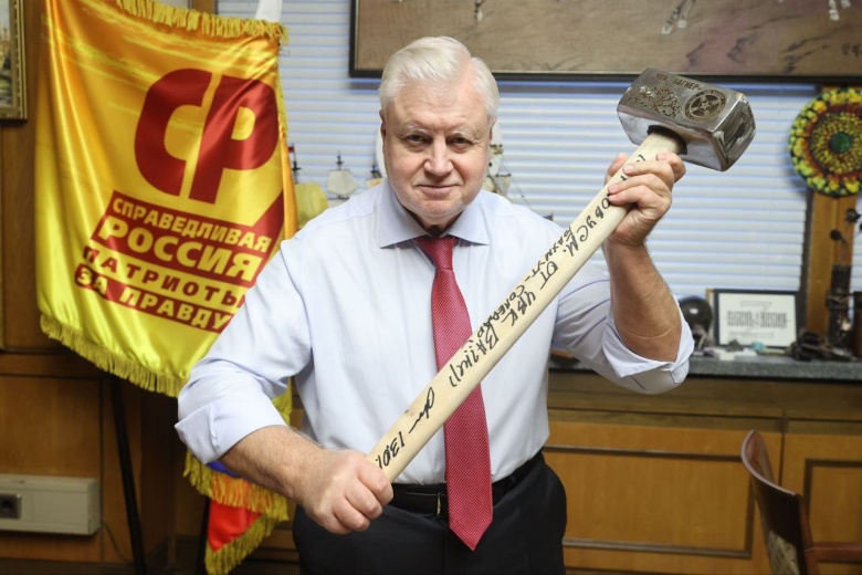 Лидер партии "Справедливая Россия" Сергей Миронов с кувалдой, подаренной ему Евгением Пригожиным