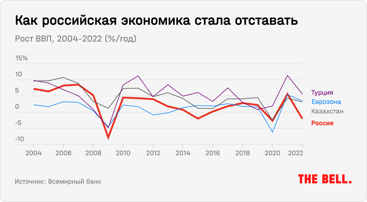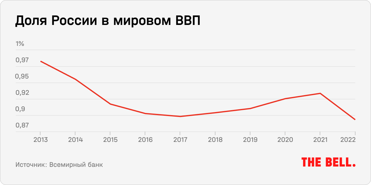 За десять лет с 2013 года ВВП на душу населения в России вырос на 5%. Это меньше как показателя большинства развивающихся стран, так и новых стран ЕС и в целом мира. Если до Майдана ВВП на душу населения в России отставал от мирового всего на 2%, то спустя 10 лет разрыв вырос в пять раз.
