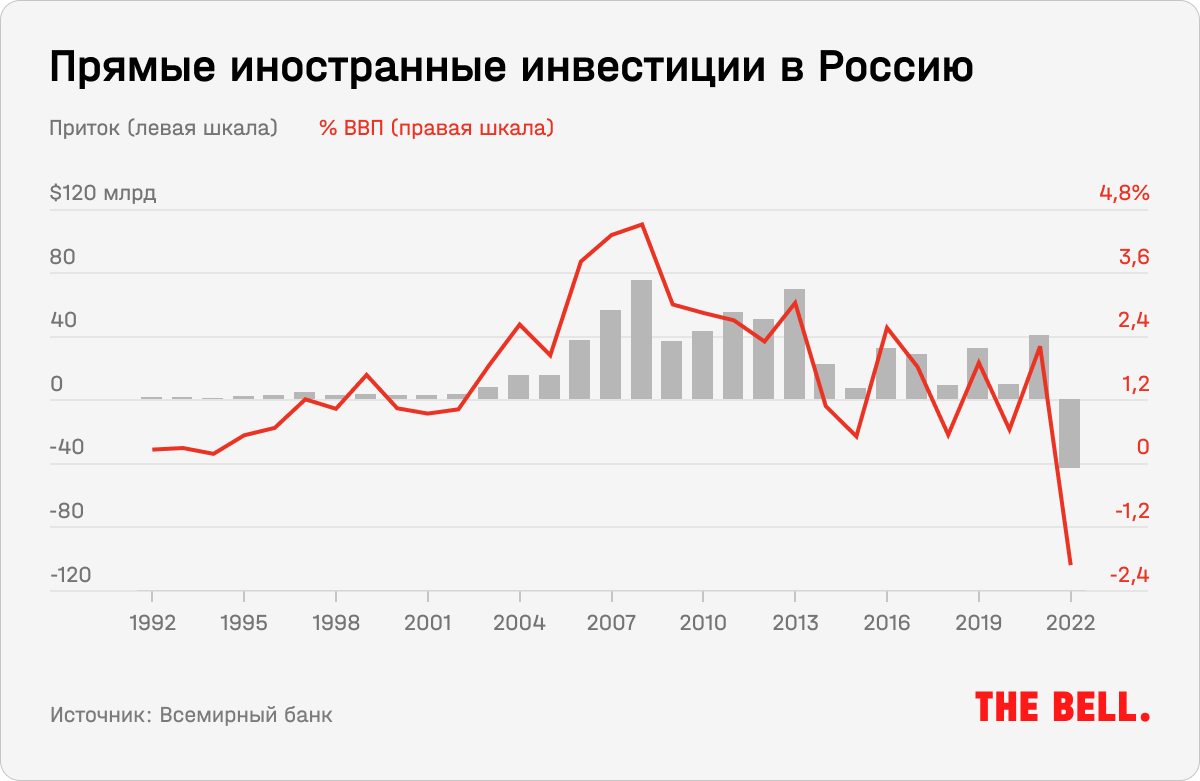 Война, начавшаяся в 2022 году, увеличила счет потерь как минимум на $300 млрд — замороженных на Западе активов правительства и бизнеса. Рост прямых иностранных инвестиций сменился после 2013 года снижением и уже больше не вернулся на прежний уровень ни в абсолютных значениях, ни относительно ВВП.