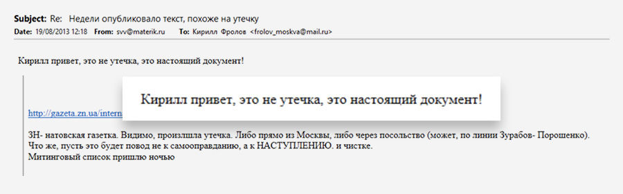 В августе 13-го Фролов поделился с svv ссылкой на опубликованный план по затягиванию Украины в Таможенный союз. И svv ему подтверждает: «Это настоящий документ». То есть это никакая не фальшивка, не выдумка либеральных журналистов или украинцев.