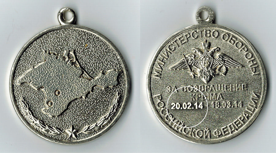 Министр обороны России Сергей Шойгу учредил ее в конце марта 2014-года — вскоре после крымского референдума. Список награжденных ею — важный источник информации о том, кто участвовал в захвате Крыма. Присмотритесь к надписи.
