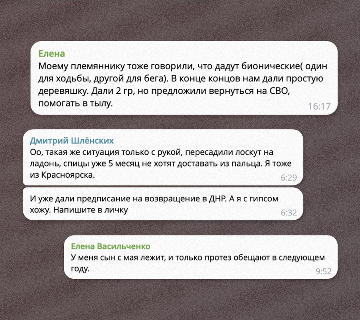 Средства реабилитации раненые получают от Минобороны, но ждать их приходится долго — по словам военнослужащих и их родственников, от полугода. Нередко после лечения даже тяжелых ранений военных заставляют вернуться на фронт, об этом пишут военнослужащие и их близкие в чатах по теме войны в «Телеграме».