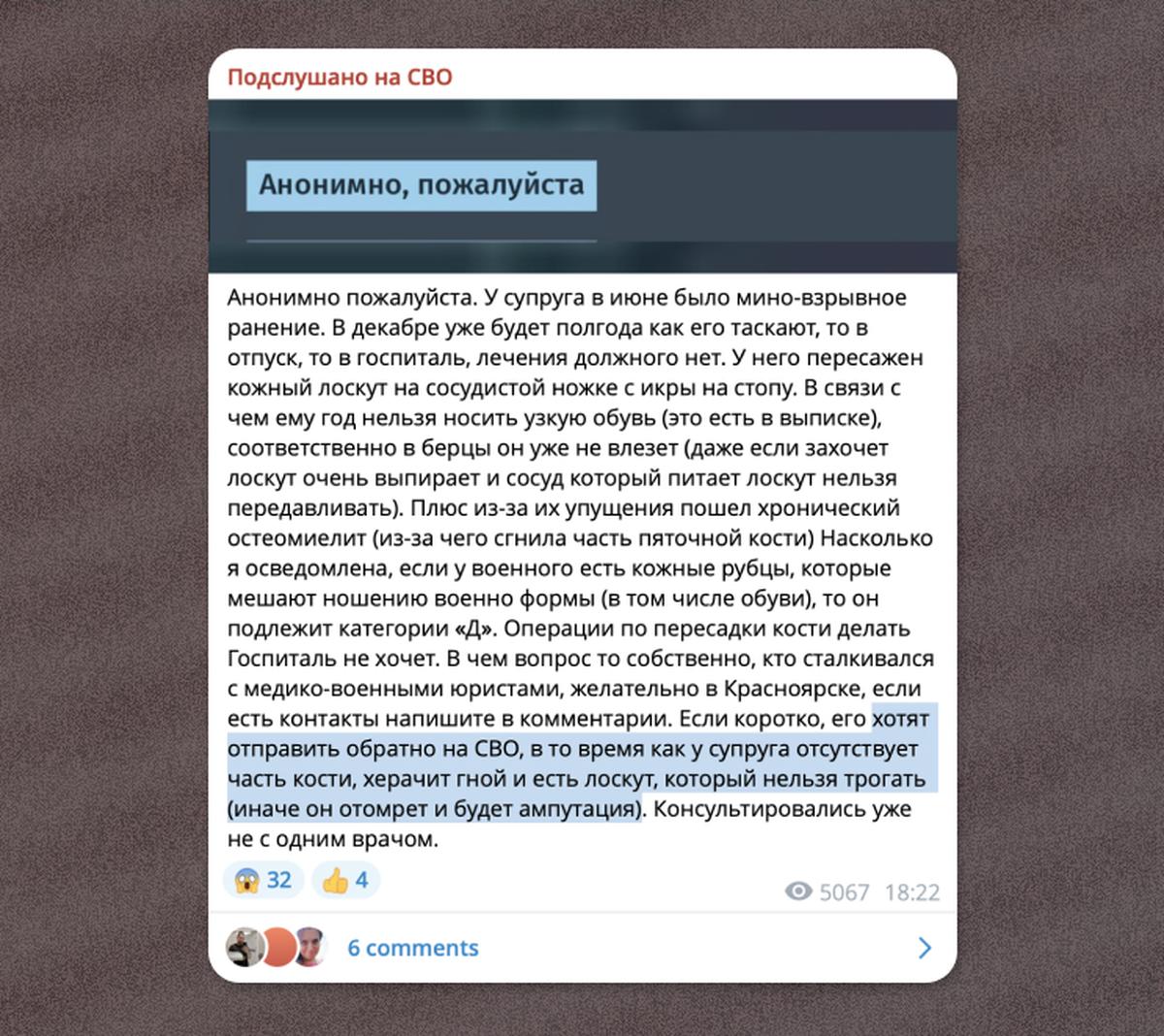 «Хотят отправить обратно на СВО, в то время как у супруга отсутствует часть кости»