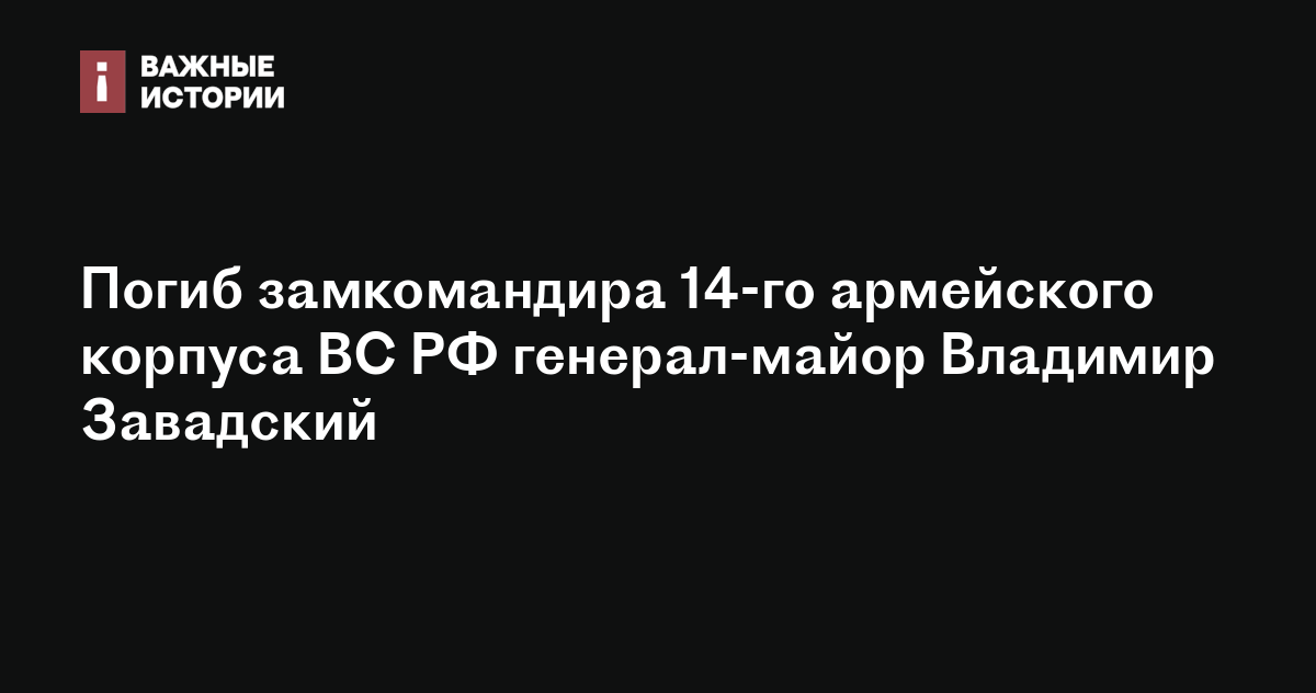 28 ноября погиб заместитель командира 14-го армейского корпуса ВС РФ генерал-майор Владимир Завадский. Об этом сообщают организация выпускников Московского высшего общевойскового командного училища «Кремль», источник ВЧК-ОГПУ и беларусский портал «Гусар News».