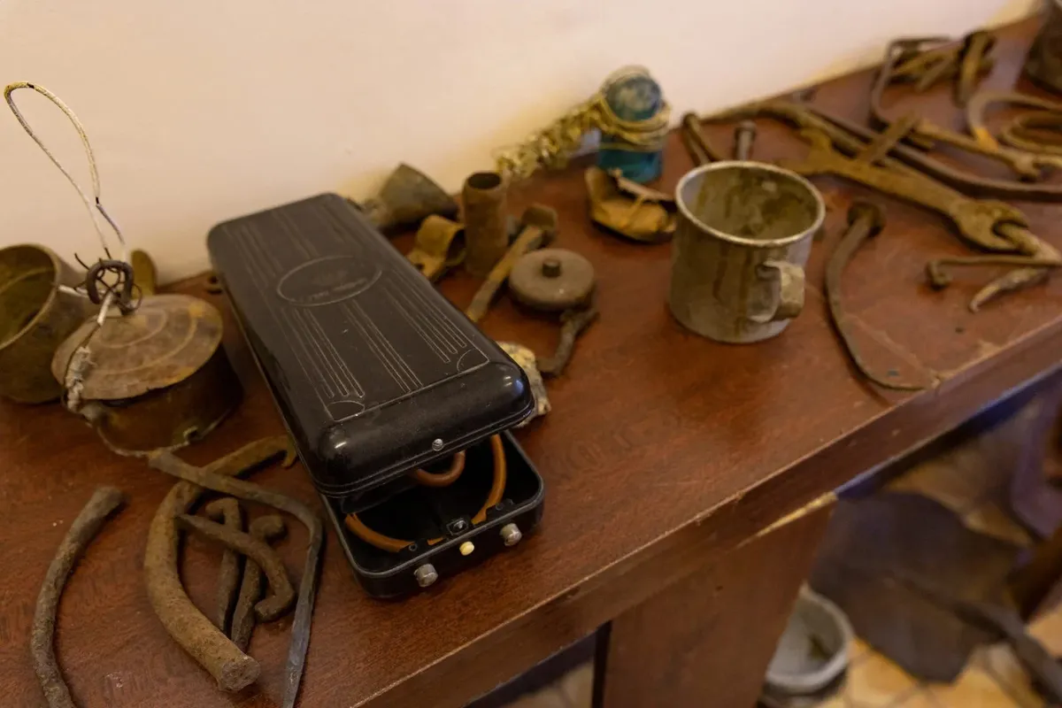 Тут лопата, ботинки, это все исторические вещи, лагерный черпак, сделанный руками заключенных. И вот эта посудина, здесь много сделано их руками, как этот светильник, например, из консервных банок.