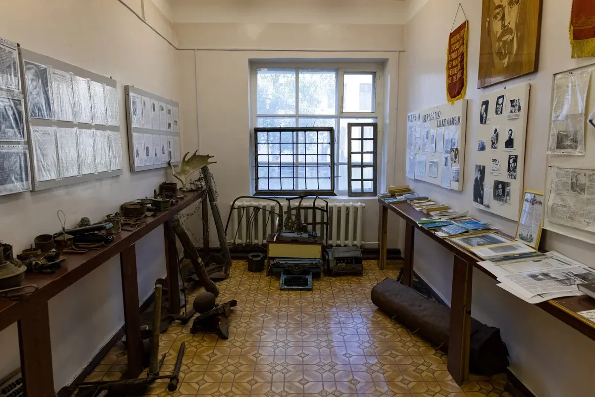 — Небольшая комната три на пять метров, заполненная лагерными артефактами. На стенах плакаты, рассказывающие о Шаламове. Вот с таким самодельным зэковским чемоданчиком, возможно, уезжал на материк на свободу сам Варлам Тихонович.
