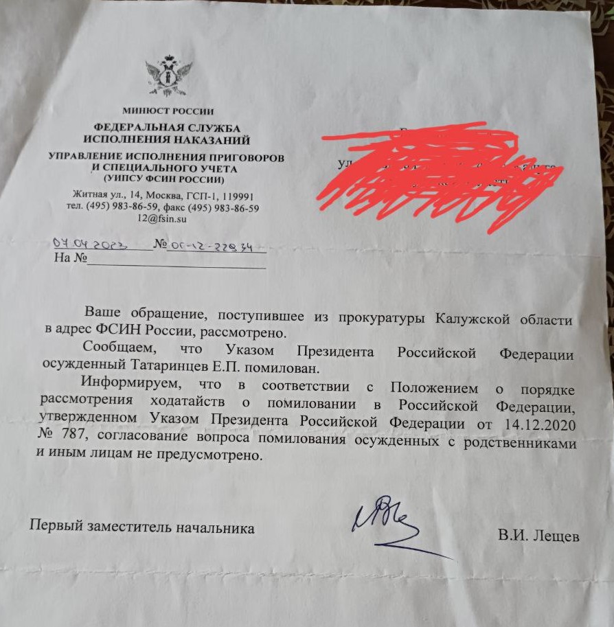 Только в письме, пришедшем из УФСИН в ответ на запрос Болтынюк, черным по белому написано: Евгений Татаринцев помилован президентом России. Это известие дополняла сухая ремарка: помилование осужденных с родственниками убитых согласовывать не обязаны.