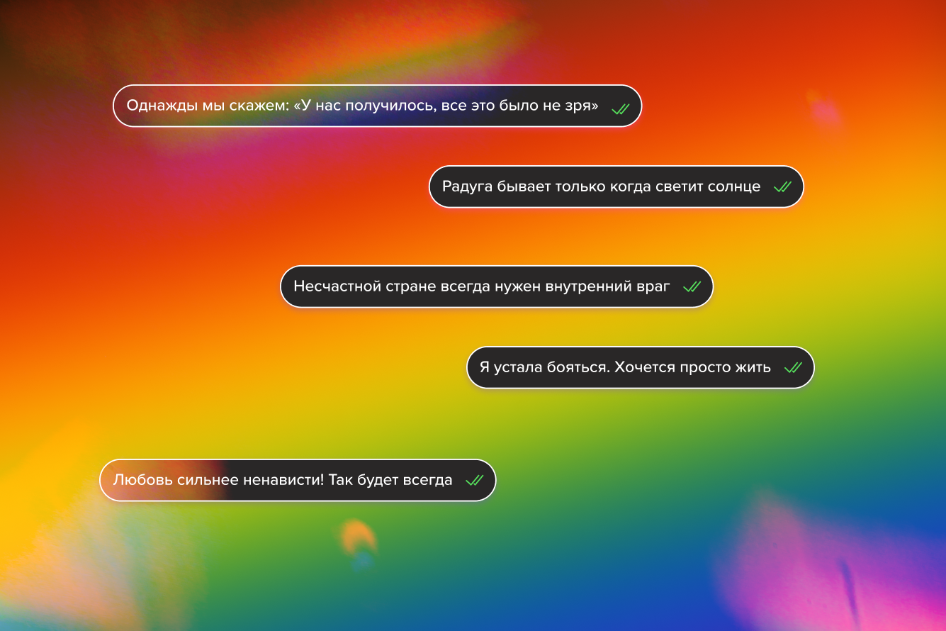 Всем, кто переживает этот ужас здесь и сейчас, хочу сказать: не теряйте себя, помните, кто вы есть, и боритесь — даже понемногу. Однажды и на нашей улице будет радужный праздник, и мы скажем: «У нас получилось, все это было не зря».