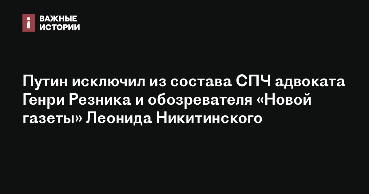 Президент РФ Владимир Путин исключил адвоката Генри Резника и обозревателя «Новой газеты» Леонида Никитинского из Совета по правам человека (СПЧ) при президенте. Указ о внесении изменений в состав СПЧ опубликован на сайте Кремля.