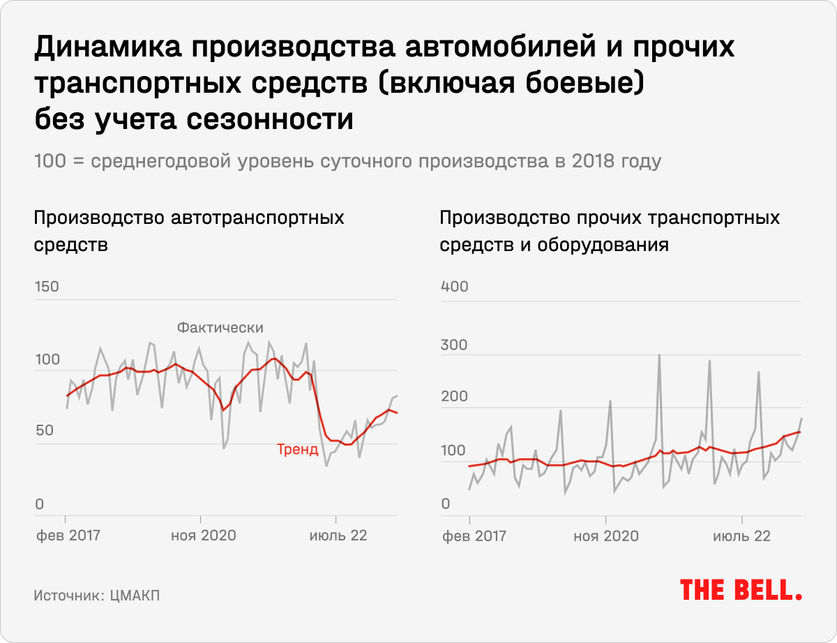 Война изменила структуру российского выпуска — оборонные направления стали преобладать над гражданскими. Это наглядно видно на примере производства автомобилей и «прочих других транспортных средств и оборудования». К последним в том числе относятся боевые военные машины и беспилотники, которые и могли послужить мощным драйвером роста производства после начала войны.
