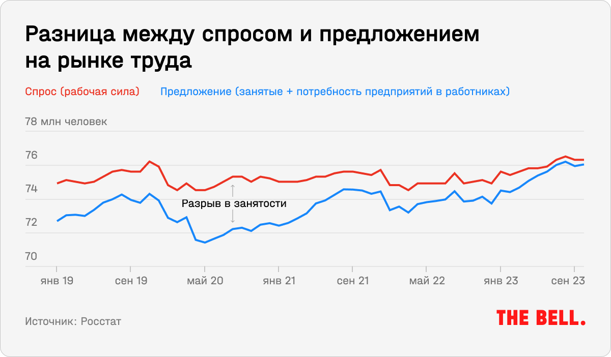 Лучше всего измерить дефицит рабочей силы можно с помощью разницы между спросом и предложением на рынке труда, указывали авторы экономического телеграм-канала «Твердые цифры». В октябре 2023 года эта разница составила 270 тысяч человек — в 4,5 раза меньше, чем в 2022 году (в среднем 1,2 млн), и в шесть раз меньше, чем в 2021-м (1,6 млн).