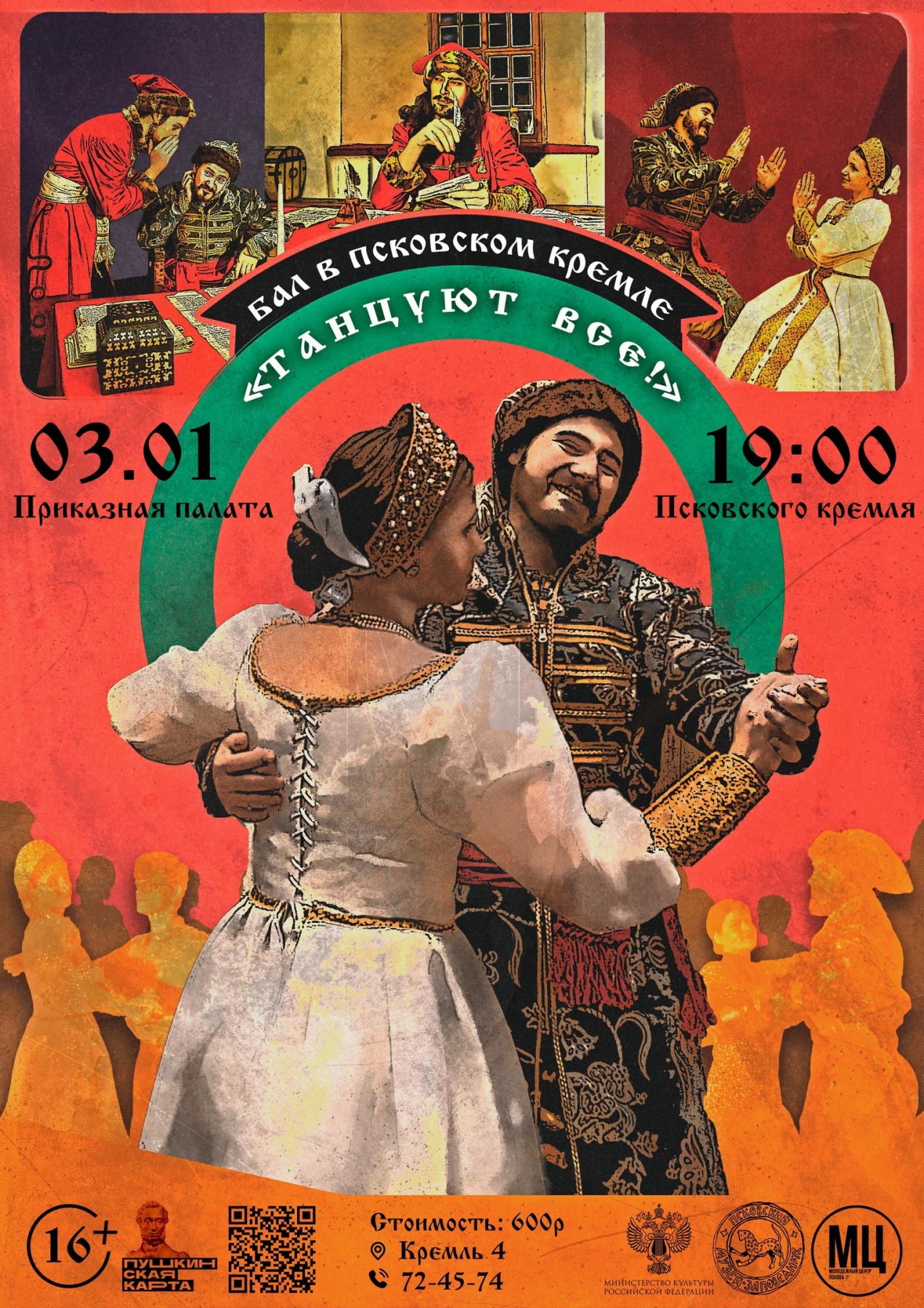 3 января в 19:00 в Приказной палате Псковского кремля пройдёт новогодний бал «Танцуют все!»: как сообщили в Псковском музее, организаторы бала вдохновились фильмом «Иван Васильевич меняет профессию», поэтому намерены создать атмосферу этой кинокартины.