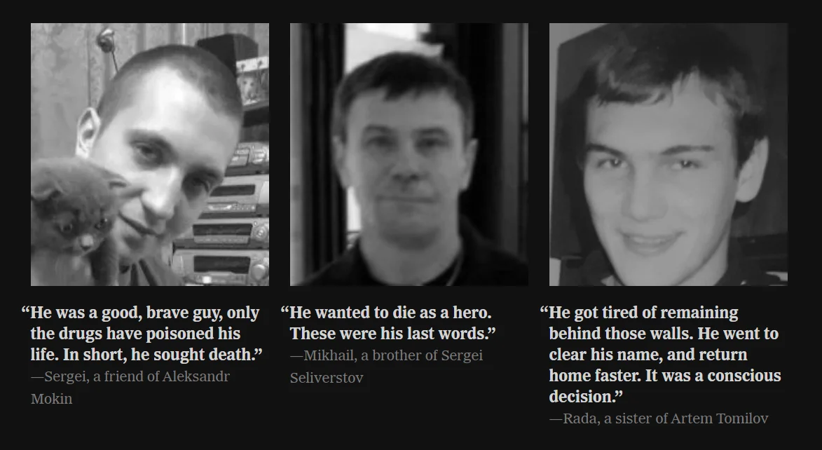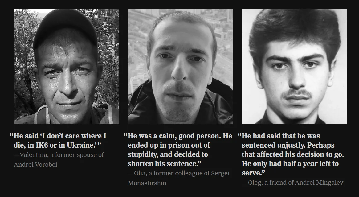 В октябре 2022 года как минимум 197 заключенных из ИК-6 под Челябинском были завербованы на войну в Украине. В распоряжении The New York Times оказались их имена и личные данные. Журналисты поговорили с 16 из них, их родственниками и друзьями, изучили соцсети, материалы судов и базу данных погибших на войне, собранную «Медиазоной». В результате удалось установить судьбу 172 завербованных заключенных. «Новая газета Европа» пересказывает материал NYT.