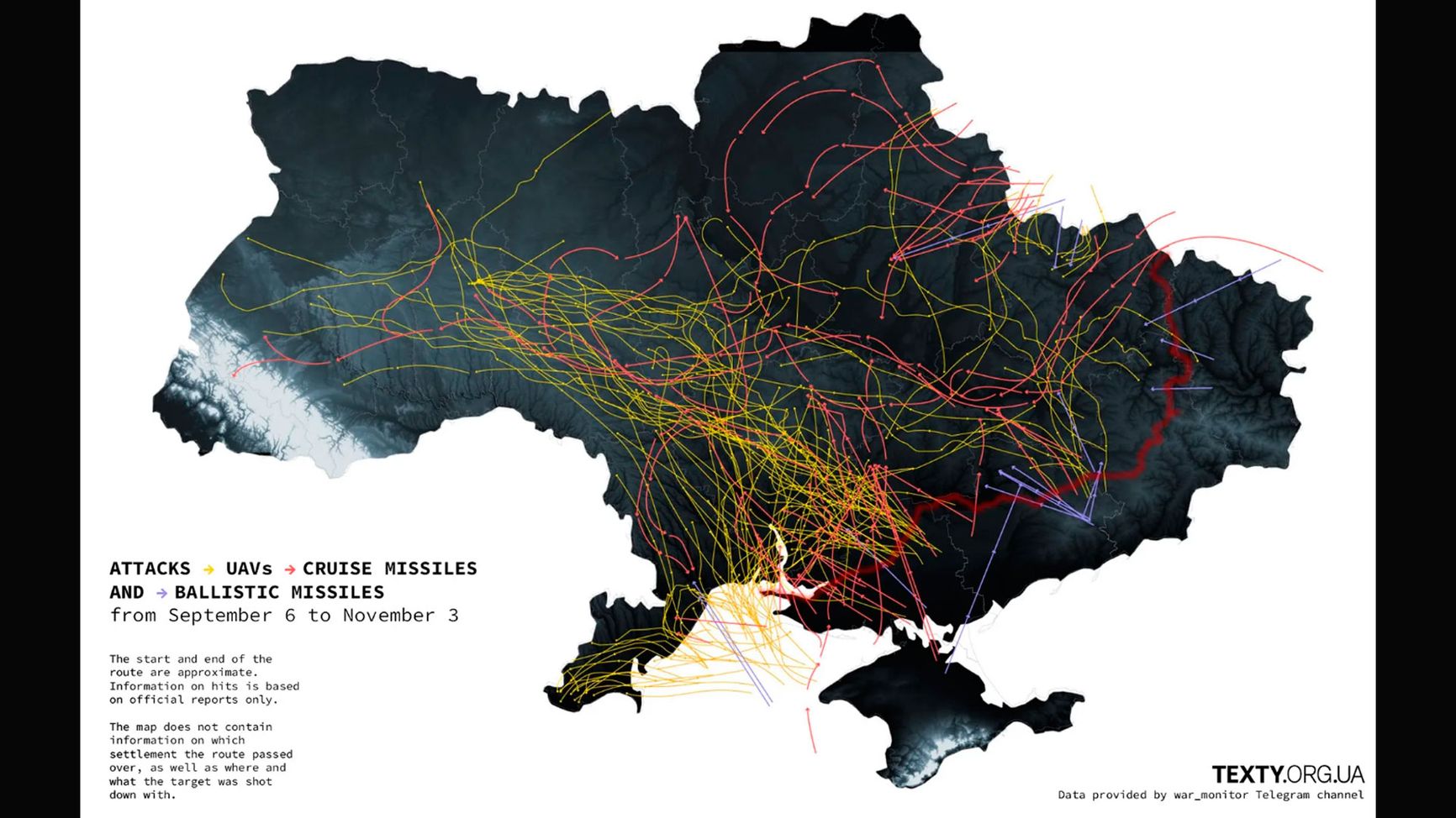 - Украинское издание «Тексти» составило карту полетных маршрутов российских ракет и беспилотников «Шахед»;