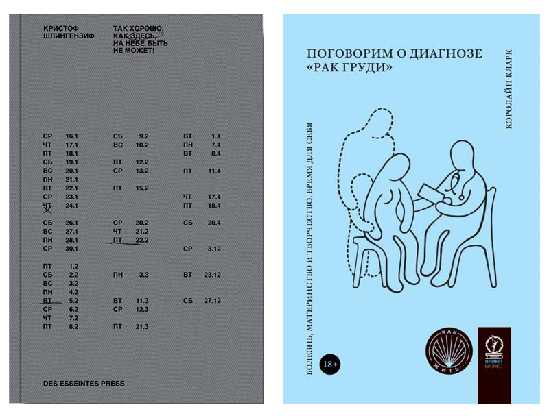 Одна книга — «Так хорошо, как здесь, на небе быть не может!» — дневник немецкого театрального режиссера Кристофа Шлингензифа, охватывающий период от постановки диагноза до ремиссии. Другая — «Поговорим о диагнозе „Рак груди“. Болезнь, материнство и творчество» — поэтический дневник британской переводчицы и писательницы Кэролайн Кларк. Оба автора до того не издавались на русском.